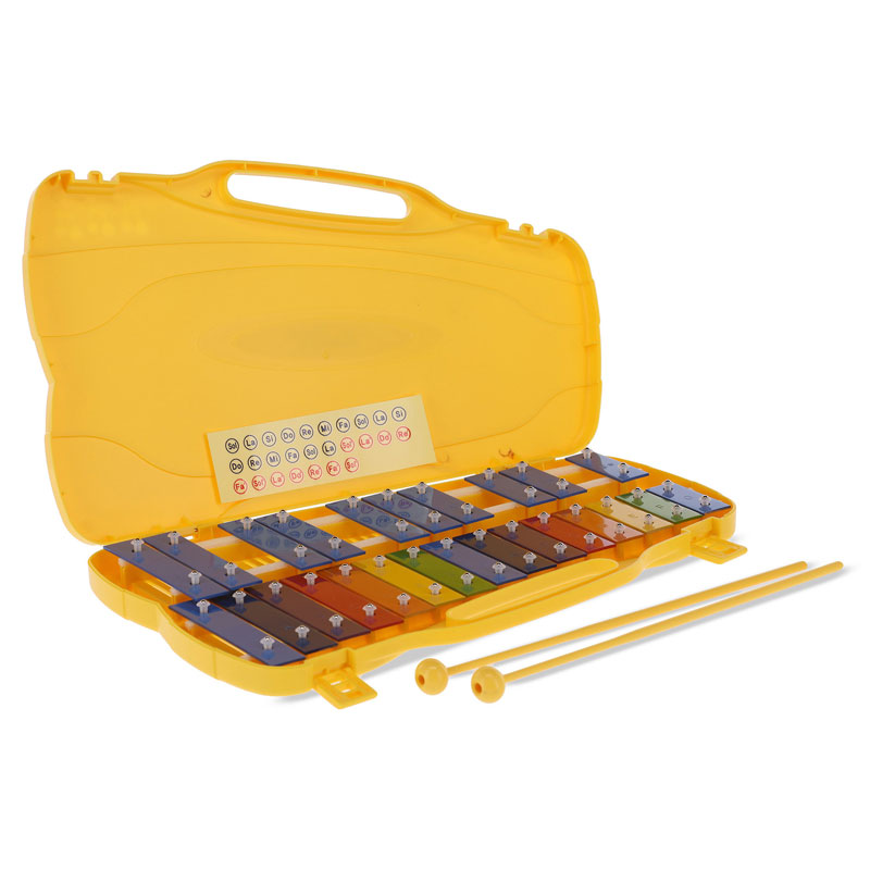 Gewa Bells 847.002 metalofon. Dvoredni hromatski metalofon u plastičnom koferu žute boje. Poseduje 25 nota (G5-G7) i dva plastična balansirana batića za sviranje. Odličan metalofon za učenike osnovne škole.