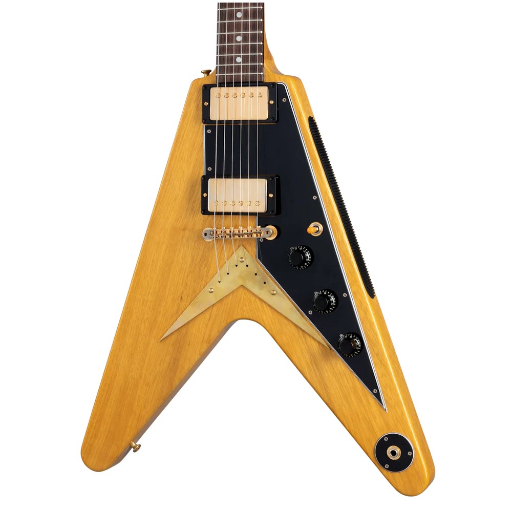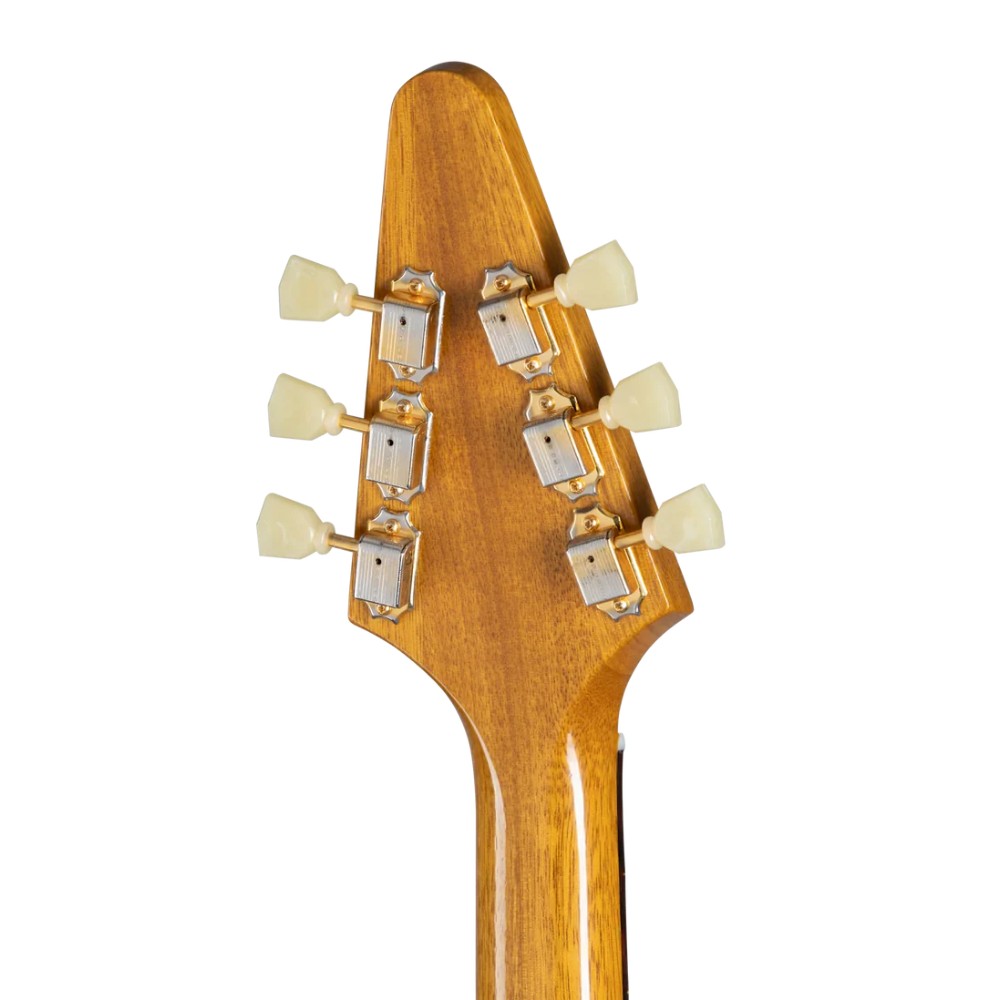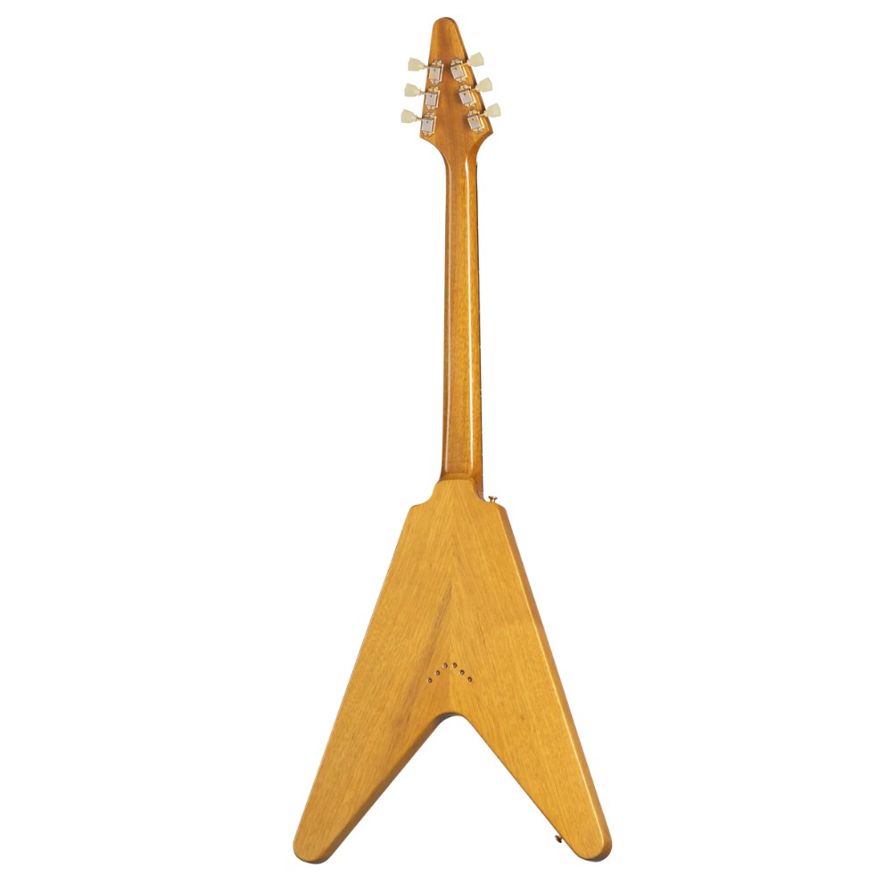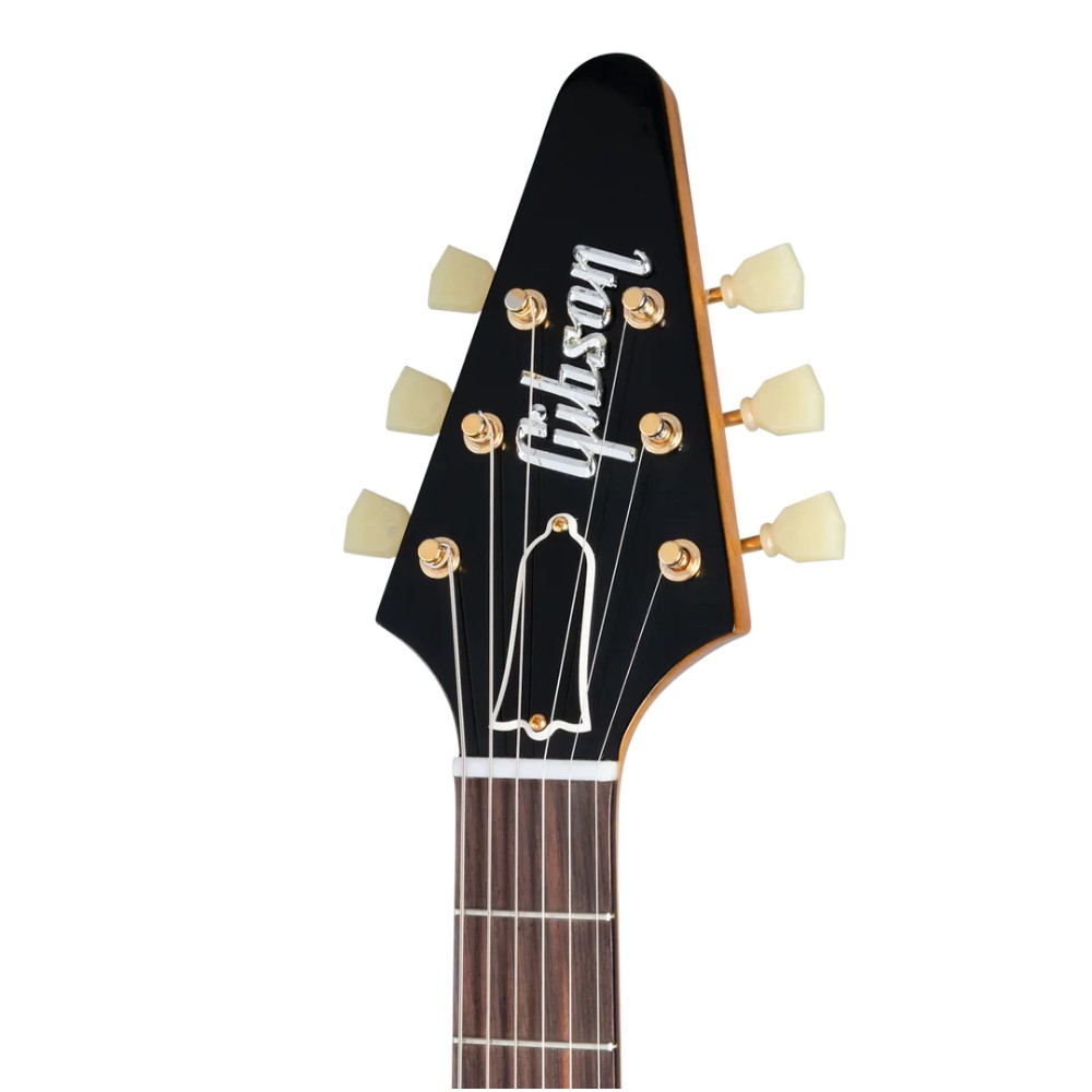 Gibson Flying V™ je bio daleko ispred svog vremena kada je predstavljen 1958. godine, i te godine je isporučeni samo 81 primerak, ali je postao veoma popularan u godinama koje su usledile. Klasične vintage karakteristike Flajing V su pažljivo rekreirane u ovom istorijskom reizdanju modela. Sadrži ABR-1 most sa telom od korine kroz žice, Kastombaker pikape, vrat od korine, grif od indijskog palisandrovog drveta, dve kontrole jačine zvuka i jednu kontrolu tona sa CTS® potenciometrima i kondenzatorom telefonskog imenika, zlatni hardver, Kluson® štimere i četvoroslojni crni pikgard. Uključena je istorijski tačna kutija, sa klasičnom smeđom spoljašnjošću i plišanom ružičastom unutrašnjošću.