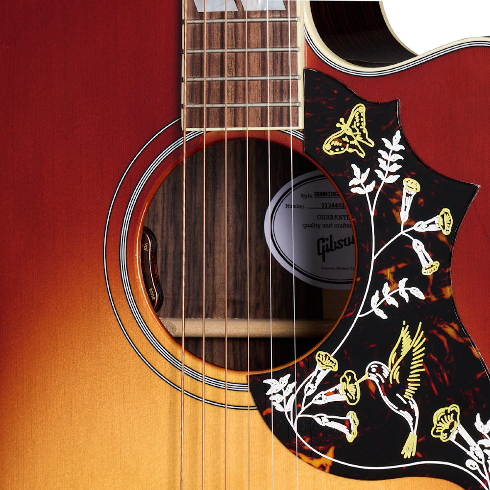 Vrat od mahagonija Hamingberda ima udoban Round SlimTaper™ profil i intarzije od sedefa u obliku paralelograma. Ova „ptica“ ima TUSQ® pinove za navrtku, sedlo i most, Grover® Rotomatic® štimere, kultnu grafiku Hummingbird na pikgardu i opremljena je L.R. Baggs™ VTC elektronikom, tako da je spremna za uključivanje na sceni ili u studiju od trenutka kada je izvadite iz priložene tvrde kutije.