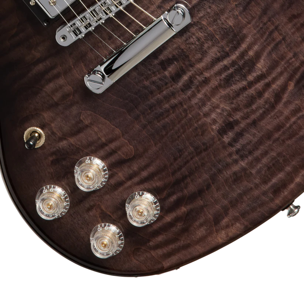 - Oba dugmeta za jačinu zvuka uključuju potisne/povucite kontrolne tačke, nudeći izbor između punoće zvuka Gibson humbucker™ i jednostrukog zvuka koji podseća na klasični glas P-90. Rezultat je instrument koji udobno pokriva širok spektar stilova - od opuštenog bluza i R&B-a do agresivnog roka i metala.