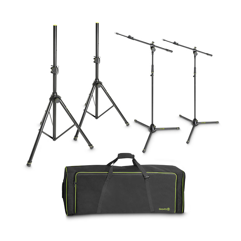 - . This set includes two Gravity GSP5211B tripod speaker stands and two GMS4322B microphone stands. With folding tripod base and 2-Point adjustment telescoping boom in the padded heavy duty GBGSS2MS2B carry bag for convenient transport.