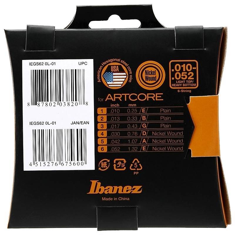 Ibanez IEGS6 žice za električnu gitaru - nickel wound, light top / heavy bottom set 10, 13, 17, 30, 42, 52, preporučljiv za hollow body instrumente.