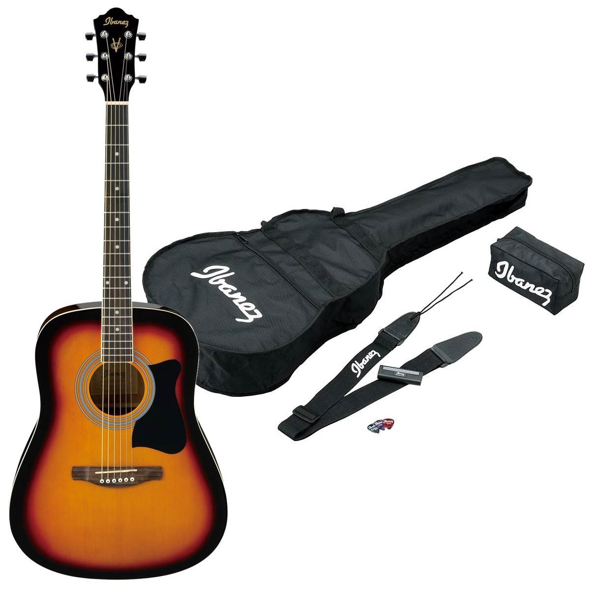 - Ibanez V50NJP-VS akustična gitara paket je kvalitetan osnovni instrument, pune veličine, dreadnought oblika. Gornja ploča od smreke, telo od agatisa, udoban vrat sa 20 pragova. Odličan izbor materijala obezbeđuje pun zvuk u celom opsegu. Pedantna izrada garantuje preciznu intonaciju, bitnu za pravilan razvoj budućih virtuoza. Osim gitare, komplet obuhvata i neophodnu prateću opremu: futrolu, štimer, kaiš, komplet trzalica, i torbicu za pribor.