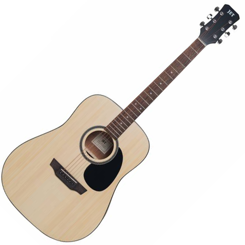 Jet JD-255 NT akustična gitara je dreadnought oblika u boji drveta. Prednja ploča je od smreke; stranice, zadnja ploča i vrat su od mahagonija. Odličan izbor za početnike, neobavezne svirače kao i povratnike. Gitara ima lep i pun ton, kakav se očekuje od dreadnought instrumenta. Open Pore finiš podrazumeva manje laka na trupu i pospešuje rezonantnost, kao i sustain.