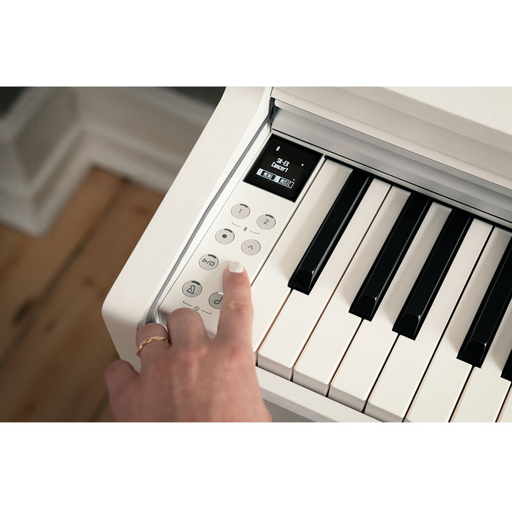 Ovaj klavir poseduje i mogućnost povezivanja preko Bluetooth-a, ugrađene lekcije, kao i mogućnost snimanja pesama; što ga čini idealnim za početnike ali i za iskusne svirače kojima je potreban klavir za tiho vežbanje sa slušalicama. U prelepom satin white finišu.