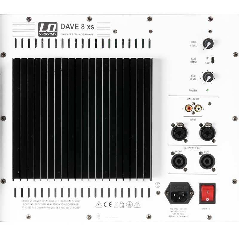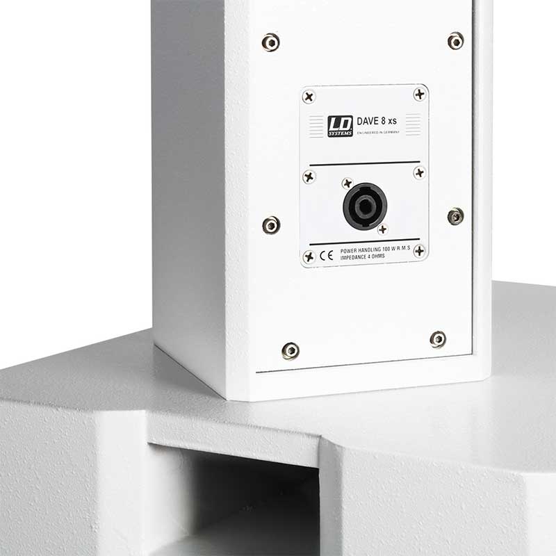 The high-performance A/B amplifier built into the subwoofer provides for both the subwoofer and the satellites. The multimedia system LD DAVE8 XS W has line inputs in XLR and RCA format and is equipped with all standard protections. The built-in limiter keeps the system safe from overload and ensures a long service life.