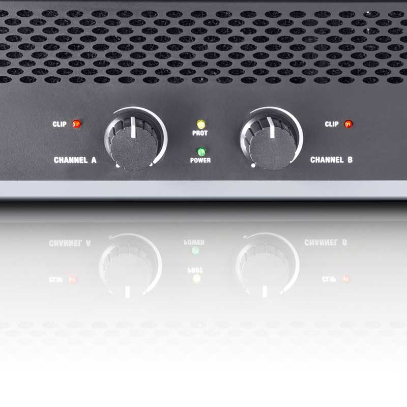 The DJ800 is the most powerful power amplifier in LD Systems' DJ series. The dependable Class AB design has an output of 400W per channel @ 4 ohms, 2x 240W @ 8 ohms and 800W in switchable bridge mode. Weighing in at just 10 kg, it is perfect for mobile use, but also for installation. The DJ800 is equipped with extensive protection circuitry and a power-on delay. The front panel perforations and a low-noise fan keep the amp cool. XLR and stereo TRS sockets are used as inputs and Speakon-compatible sockets and heavy-duty screw terminals as outputs. A ground lift switch eliminates ground loop hum. LEDs on the front panel next to the easy-grip volume controls indicate functional status, overloading, and triggering of the protection circuit. The DJ800 functions in the entire frequency range of 20Hz - 20kHz with maximum dependability, dynamics, and impulse fidelity.