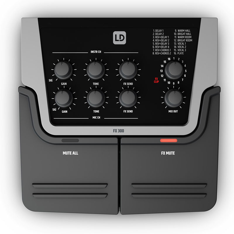 - Čak iako niste imali vremena da imate tonsku probu ova mala ali izuzetno korisna naprava ne služi samo kao efekat za vokal i instrument, već kao praktični dvokanalni mikser. Jedna od najzgodnijih opcija su mute funkcije koje mogu da se kontrolišu i nogom i rukom. Ako imate nešto da kažete, dovoljno je da jednim pokretom mutirate sve efekte sa FX MUTE pedal, tako da se Vaš glas čuje glasno i jasno, bez ikakvih efekata. Za pauze između pesama dovoljno je da pritisnete MUTE ALL pedalu. LD Systems FX 300 vokalni procesor je opremljen sa 16 digitalnih efekata u 16 bitnom kvalitetu, dva ulaza sa odvojenim gain podešavanjima i balansiranim i nebalansiranim izlazom. Fantomsko napajanje omogućava korišćenje i kondezantorskih mikrofona. Visoka impedansa, low noise instrumentalni ulaz ne samo da su odlični za akustične i bas gitare već za sve instrumente. Pomoćno napajnje na bateriju od 9 V obezbeđuje do 5 sati rada.