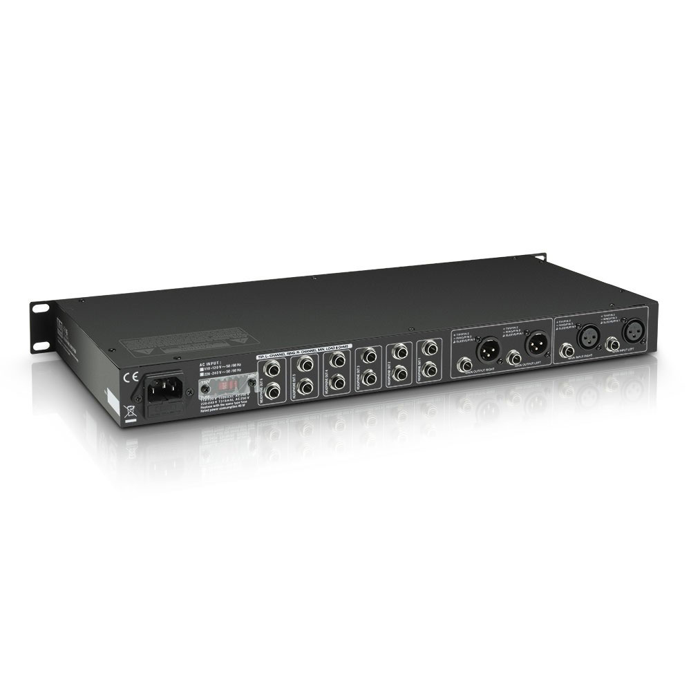 - Indicators: 6 x channel level meter (4-segment LED chain), 6 x mono LED, 6 x Mute L&R LEDs, Main Input/Direct In Level Meter (8-segment LED chain), power LED