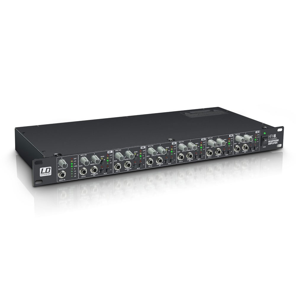 LD Systems HPA 6 pojačalo za slušalice sa šest kanala 1U 19" rack formata. Dva 6.3mm TRS izlaza na zadnjem panelu omogućavaju povezivanje ukupno 18 pari slušalica.