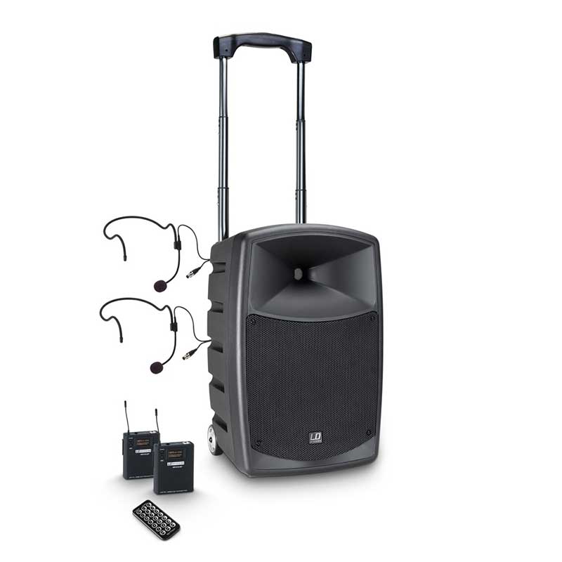 The LD Systems Roadbuddy 10 is an elegant solution for voice and music transmission on the go. The 2-way speaker with a 10" custom woofer and a 1" compression driver is operated with a rechargeable battery for up to 8 hours and is powered by a class D power amplifier with a highly efficient switching power supply and 480 watts of peak power. The Roadbuddy relies fully on wireless transmission: it has an UHF radio receiver which operates in the license-free 863 - 865 MHz range. The on-board Bluetooth player with backlit multifunction display ,equalizer, USB port and SD card slot supports the mp3, wma and wav formats. Two handheld microphone with 10 mW output power(LDRBUD10HHD2), two headset microphones with belt pack (LDRBUD10BPH2) or as an alternative a handheld microphone and a headset microphone with belt pack (LDRBUD10HBH2) and an IR-remote control for the player are included. For wired devices, the Roadbuddy has two channels with combo jacks and individual volume controllers that are switchable for microphone and line level, a stereo input via RCA (Cinch) sockets (mono summed) and a 3.5 mm Aux input. Treble, Bass, Echo and Master volume controllers complete the control panel. The LD Systems Roadbuddy is easily transportable thanks to built-in castor wheels and a pull-out handle. On the top, there is a handy storage compartment for up to two hand-held transmitter microphones. The plastic housing of this lightweight device has been designed to accommodate a 35 mm tripod mount.