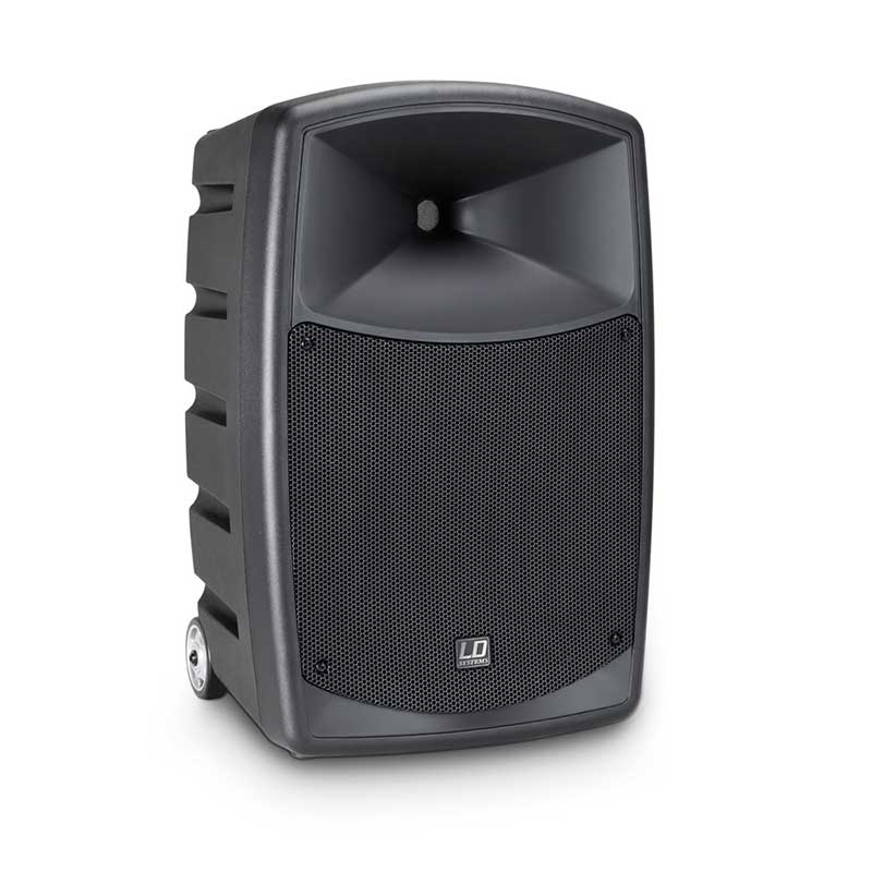 The LD Systems Roadbuddy 10 is an elegant solution for voice and music transmission on the go. The 2-way speaker with a 10" custom woofer and a 1" compression driver is operated with a rechargeable battery for up to 8 hours and is powered by a class D power amplifier with a highly efficient switching power supply and 480 watts of peak power. The Roadbuddy relies fully on wireless transmission: it has an UHF radio receiver which operates in the license-free 863 - 865 MHz range. The on-board Bluetooth player with backlit multifunction display ,equalizer, USB port and SD card slot supports the mp3, wma and wav formats. Two handheld microphone with 10 mW output power(LDRBUD10HHD2), two headset microphones with belt pack (LDRBUD10BPH2) or as an alternative a handheld microphone and a headset microphone with belt pack (LDRBUD10HBH2) and an IR-remote control for the player are included. For wired devices, the Roadbuddy has two channels with combo jacks and individual volume controllers that are switchable for microphone and line level, a stereo input via RCA (Cinch) sockets (mono summed) and a 3.5 mm Aux input. Treble, Bass, Echo and Master volume controllers complete the control panel. The LD Systems Roadbuddy is easily transportable thanks to built-in castor wheels and a pull-out handle. On the top, there is a handy storage compartment for up to two hand-held transmitter microphones. The plastic housing of this lightweight device has been designed to accommodate a 35 mm tripod mount.