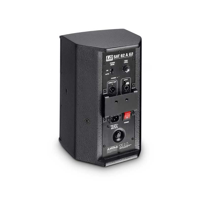The LD Systems SAT62AG2 is the active version of the SAT62G2. The compact 2-way speaker is not only suitable for installation, but also as a home studio monitor and for other sound reinforcement tasks. The bass-reflex design is loaded with a 6.5" custom woofer and a 1“ silk dome tweeter with wave guide, which are driven by a Class AB power amplifier with 50 W RMS power and overcurrent protection. The input is a XLR-jack combo socket, an XLR socket permits looping through of the signal. Reproduction is balanced and dynamic throughout the frequency range of 55 Hz - 20 kHz and attains a maximum sound-level pressure of 108 dB. The SAT62AG2 features a switchable power saving mode that automatically switches to standby if there is no signal for 3 minutes. The 12 mm MDF cabinet with a durable textured coating is available in black and white and equipped with M6 rigging points. An included mounting bracket offers additional possibilities for mounting; a universal joint mount is available as an accessory.