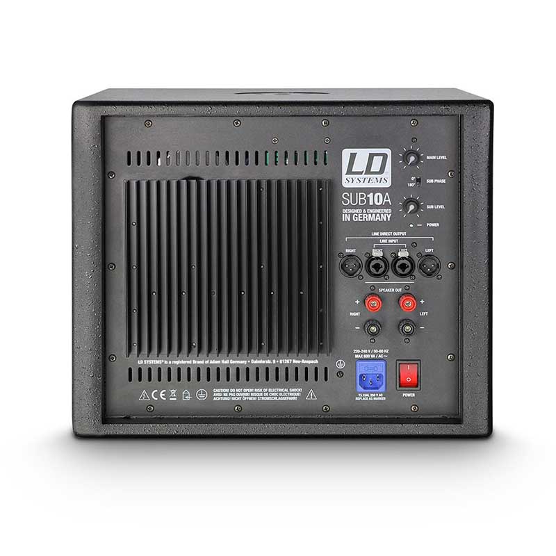The LDSUB10A is a very compact and powerful 10" subwoofer and a genuine multitalent that can be used as an additional bass cabinet in conjunction with full-range speakers (Stinger 8" or Stinger 10") and is also suitable for permanent installations. This subwoofer features an integrated 3-channel power amplifier (3 x 120 W RMS), thus permitting connection of additional passive full-range speakers or installation speakers such as those in the LD SAT series.