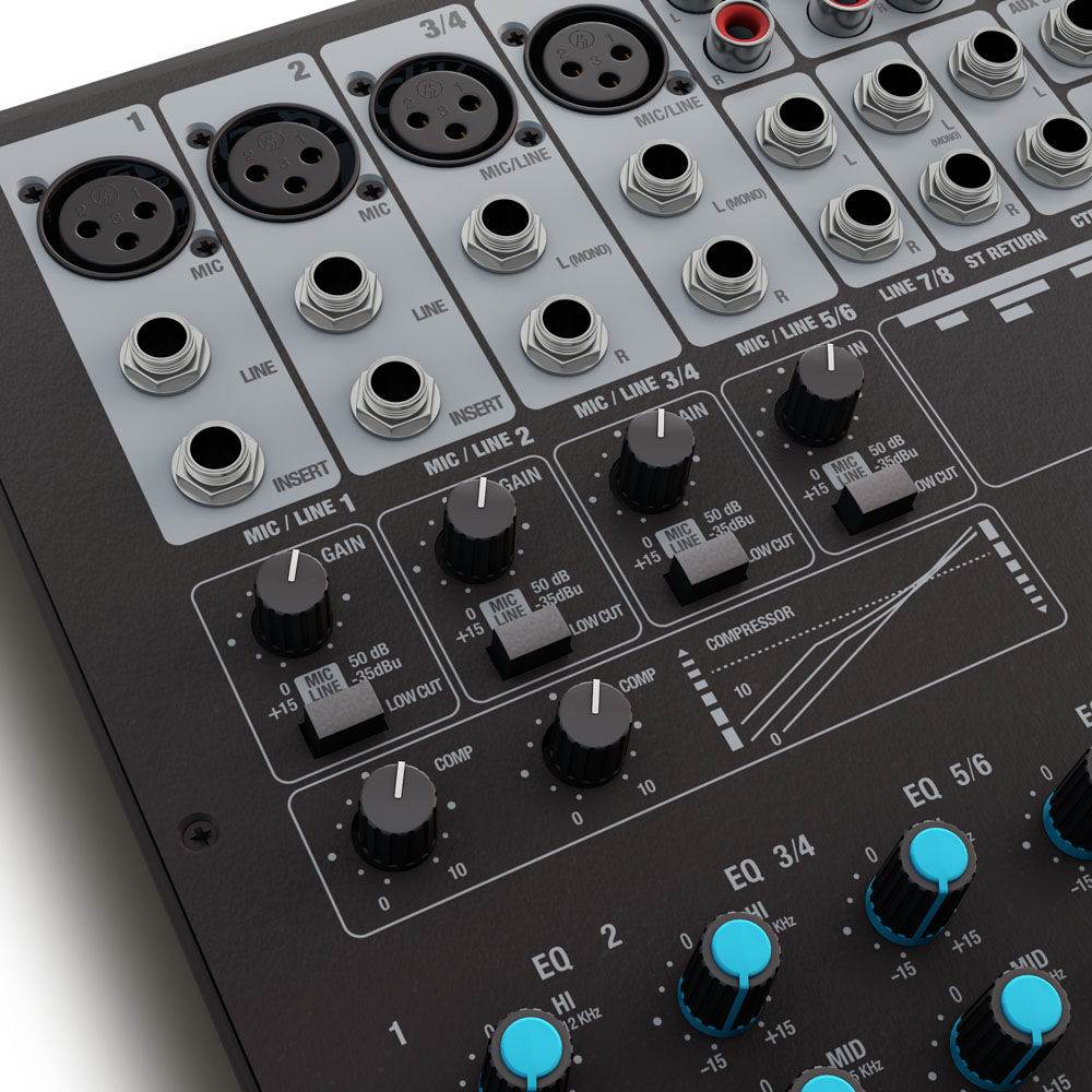 - Ima četiri balanisrana mikrofonska ulaza koji sardže mikrofonsko predpojačanje napravljena od visoko kvalitetnih komponenti, low cut filter fantomskim napajanjem i tropojasnim ekvilajzerom, kompresor na prva dva kanala, zatim tri stereo linijska ulaza sa dvopojasnim ekvilajzerom koji su mono kompatibilni i po jedan efect loop po kanalu. Sadrži banku od 16 efekata koji se mogu dodeliti i dozirati svakom kanalu ponaosob. Strujni adapter je uključen u cenu.