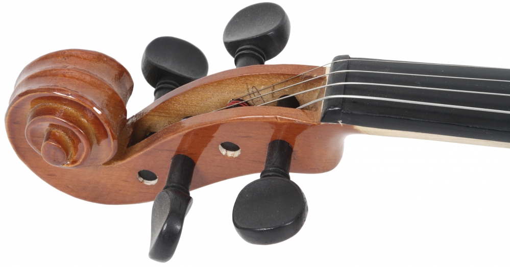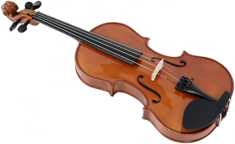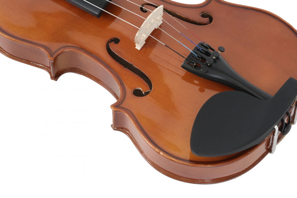 - Prednja ploča, stranice i leđa od laminiranog drveta, fingerboard od hardwood drveta. U kompletu sa koferom, gudalom i kalafonijumom.