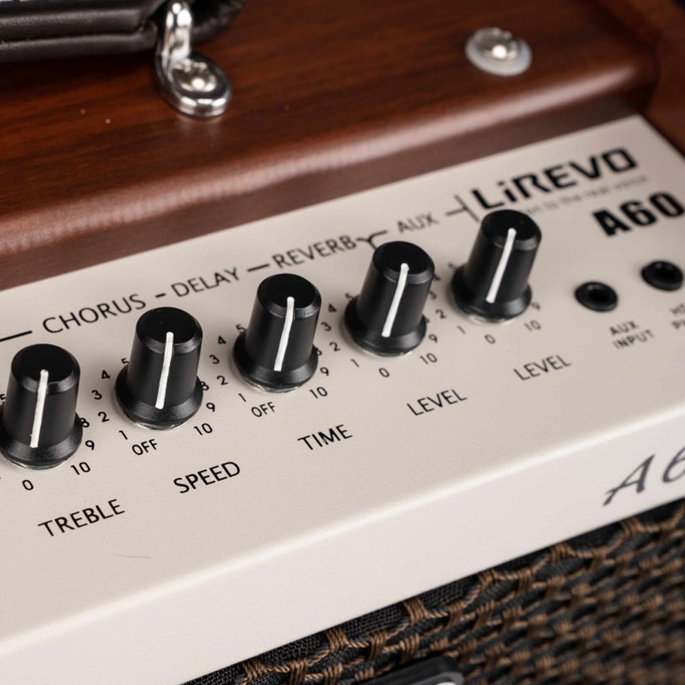 Lirevo A60 60W pojačalo za akustičnu gitaru je dvokanalno pojačalo sa 6.5″ zvučnikom i efektima.