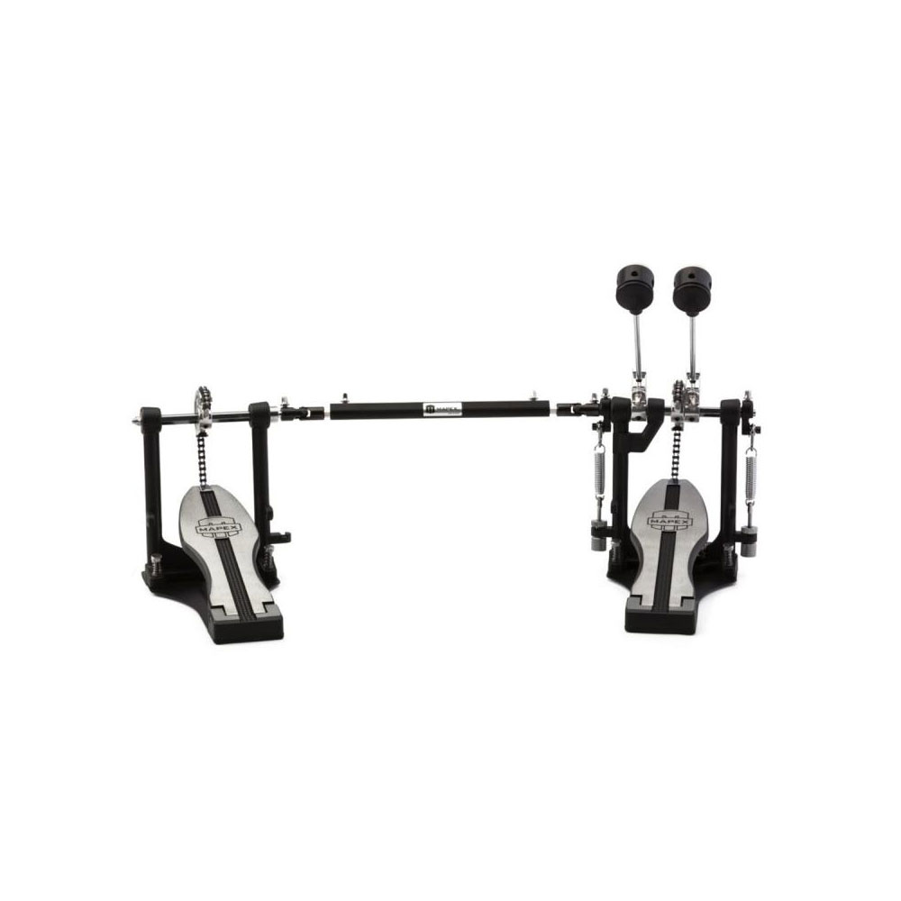 MAPEX P410TW dupla pedala. With standard features like single-chain drives, adjustable spurs, reversible beaters and solid base plates the P410 pedals provide solid performance and durability at a price that’s perfect for younger players making their first step-up pedal purchase.