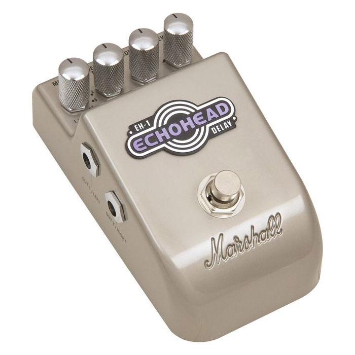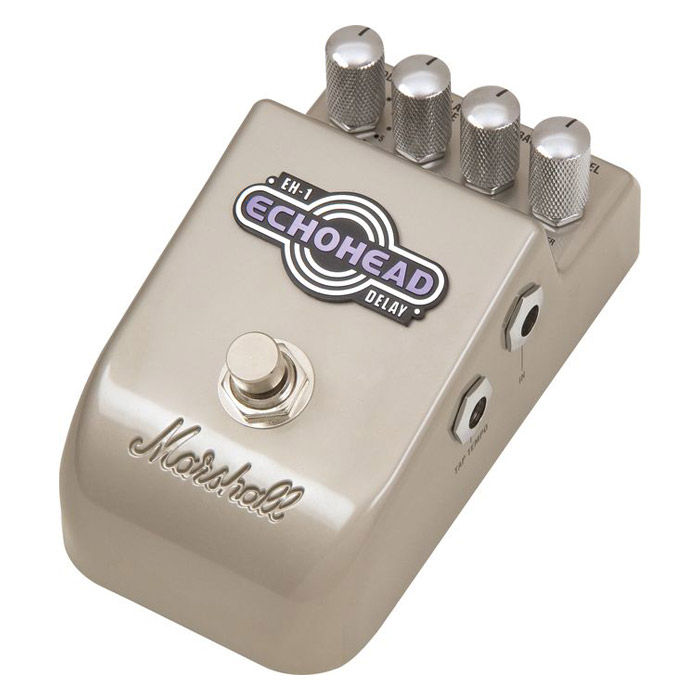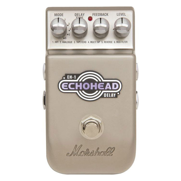 The Marshall Echohead Digital Delay features HiFi, Analogue, Tape Echo, Multi Tap, Reverse, and Modulation Filter settings. Controls include Delay Mode, Delay Time, Feedback, and Level producing everything from crystal-clear repeats to classic analog echo