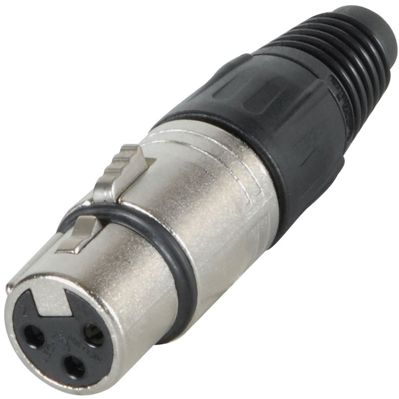 Neutrik NC3FX ženski XLR konektor u nikl boji sa plastičnim poklopcima.