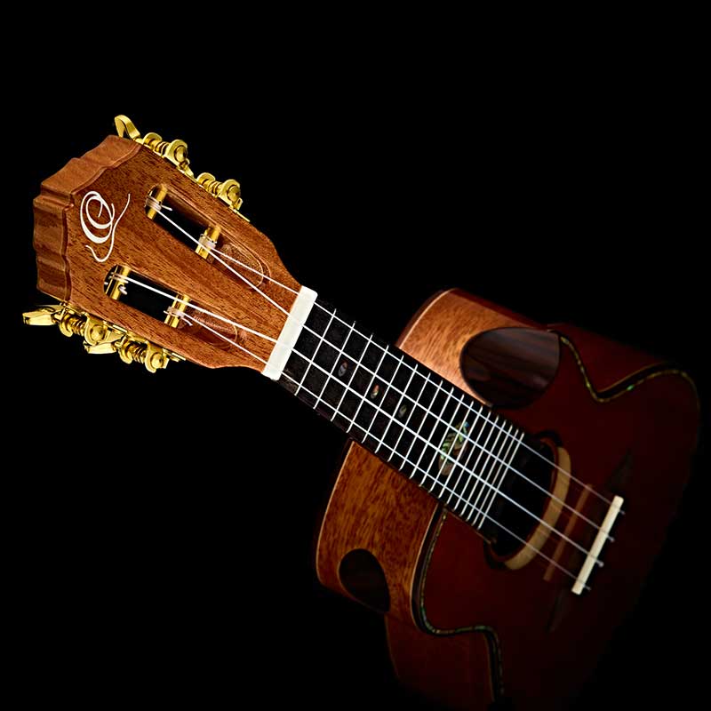 The Ortega ECLIPSE-CC4 Concert Ukulele. Mahogany provides the player with a beautifully designed concert sized ukulele with an entire solid-wood construction, comfortable armrest, cutaway, and a free gig bag. Perfect for the ukulele player craving a solid-wood instrument with an incredibly eye-catching design. With a body constructed entirely from solid mahogany. Ortega ECLIPSE-CC4 produces a lively, classic and bouncy ukulele sound. Delivering warmth, resonance and a punchy mid-range. Ortega ECLIPSE-CC4 features a concert body which is a popular choice among ukulele soloists due to its 18 frets, allowing more technical skills to be performed thanks to the extended range. Ortega ECLIPSE-CC4 Concert Ukulele also features a scooped cutaway profile with a built-in armrest, providing comfort and easy access to upper frets. The ECLIPSE-CC4 offers a breathtaking appearance from its rosewood body binding, abalone inlays, and eclipse inspired ornate details. Perfect for the player with a nature-loving vibe.