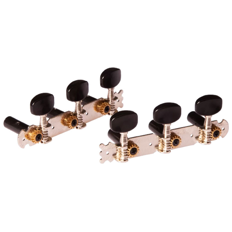 Ortega OTM-STUDENT čivije za klasičnu gitaru : u 3 + 3 konfiguraciji. Sa hromiranom bazom, osovinama od crnog najlona i crnim dugmićima. Ove čivije odgovaraju Student seriji Orteginih gitara ali i najvećem broju klasičnih gitara drugih prozvođača.