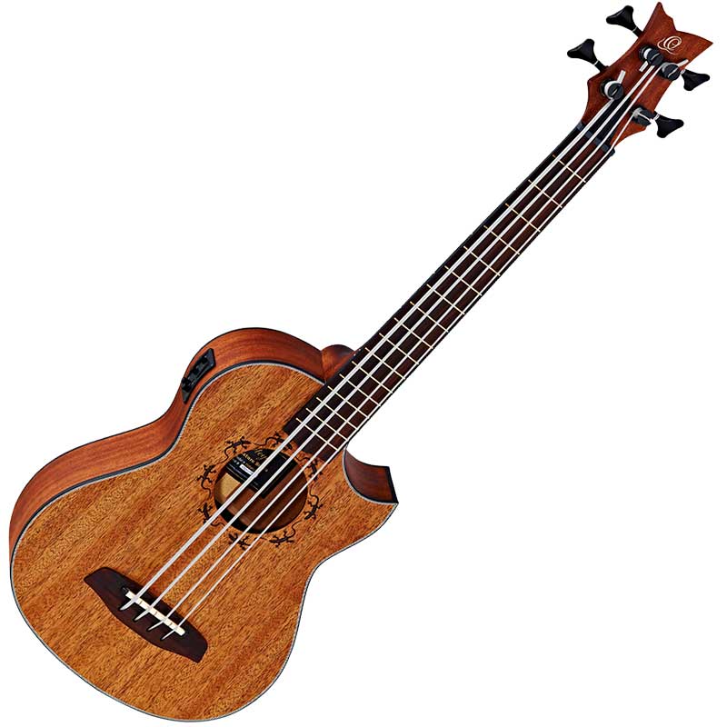 The Ortega PM-SHAMAN Electro Acoustic Bass, Satin Mahogany offers an eye-catching ukulele bass with a comfortable playing experience combined with on-board electronics and a sonically pleasing character that falls within the warmer end of the tonal spectrum. With a solid mahogany top attached to mahogany back and sides, the Ortega PM-SHAMAN produces a warm, rich, full sound with plenty of resonance and emphasis within the mid-range. This unique electro acoustic bass features a 625 mm scale length and Aquila Thundergut uke bass strings, providing players with the warmth and playability of a ukulele with the deep, thundering tones of a bass guitar. Furtermore, with the playability of a ukulele the Ortega PM-SHAMAN offers a comfortable playing experience whilst its florentine cutaway provides a striking visual and promotes upper fingerboard shredding with easy access. As well as all this, the PM-SHAMAN comes equipped with an Ortega Magusuke bass preamp system, offering basic sound tweaking for live and rehearsal settings, perfect for the gigging musician that craves something a little unique to add to their bass collection.