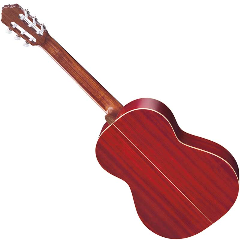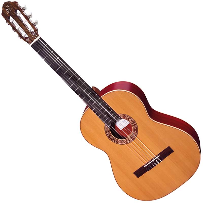 Ortega R200L klasična gitara. This classical, left handed guitar has a solid Cedar top, high gloss finish and comes with an Ortega gigbag. The back and sides are constructed from Palo-rojo, a regional description for African Padouk. The wood is hard and tight but flexible and a coral red colour which can darken to deeper red.