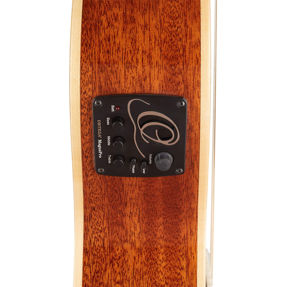 - Telo od sapele pruža fenomenalan tonski balans, dok vrat od mahagonija omogućava laku svirljivost. Ortega MagusPro elektronika daje neverovatan zvuk koji zajedno sa ostalim karakteristikama čini ovaj model gitare odličnim izborom za sve tipove gitarista.