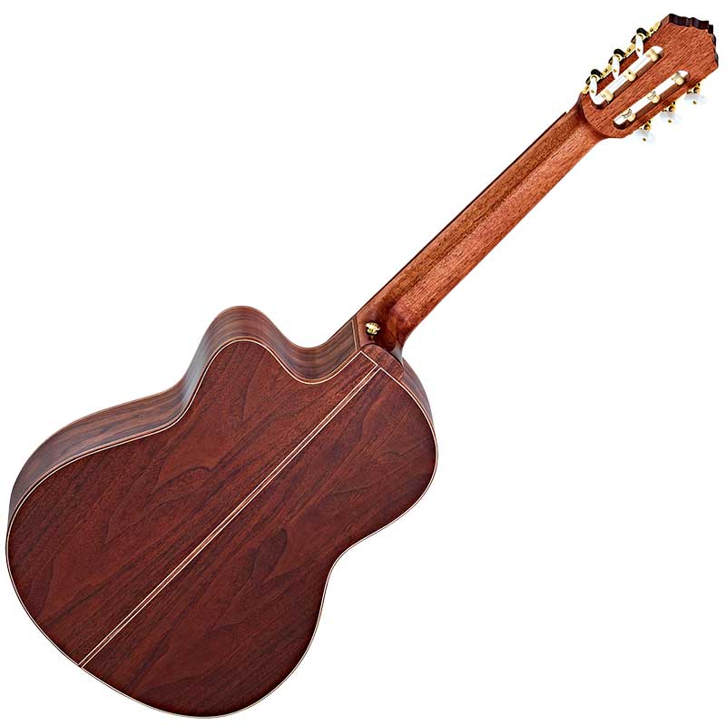 Ortega RCE159MN klasična gitara. The Ortega Ortega RCE159MN offers outstanding warm tones thanks to its solid cedar top and rosewood back and sides, as well as elegant visual beauty. This outstanding classical guitar is fitted with the Ortega MagnusPro preamp for easy and rewarding amplification. Whilst the authentic Spanish heel and cutaway body allow for comfortable access to the entire fingerboard. The guitar also features a medium neck that sits directly between a standard classical neck. Ortega's popular slim neck width. The stunning rosewood, maple and pearl rosette is a defining addition to the look of the RCE159MN, and the included deluxe gig bag and strap make it easy to protect your instrument.
