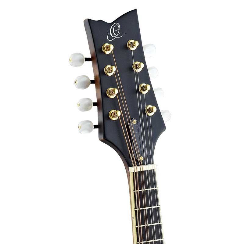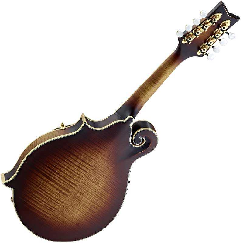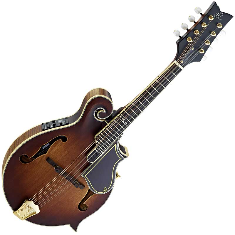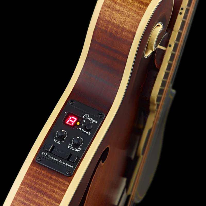 Ortega RMFE100AVO mandolina. The Ortega RMFE100 Mandolin Antique Violin Oiled. Features an F-Style body made from a combination of a Flamed Maple back and sides with a Solid Spruce top. A set of D’Addario EXP74 mandolin strings line the instrument while the neck holds an ebony fingerboard on which 24 frets lie. An onboard S1T Preamp system allows this instrument to be amplified without any additional tonal colour. The aesthetic of this instrument is truly complimented by its Violin oiled finish.