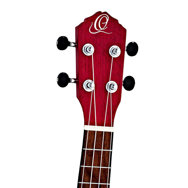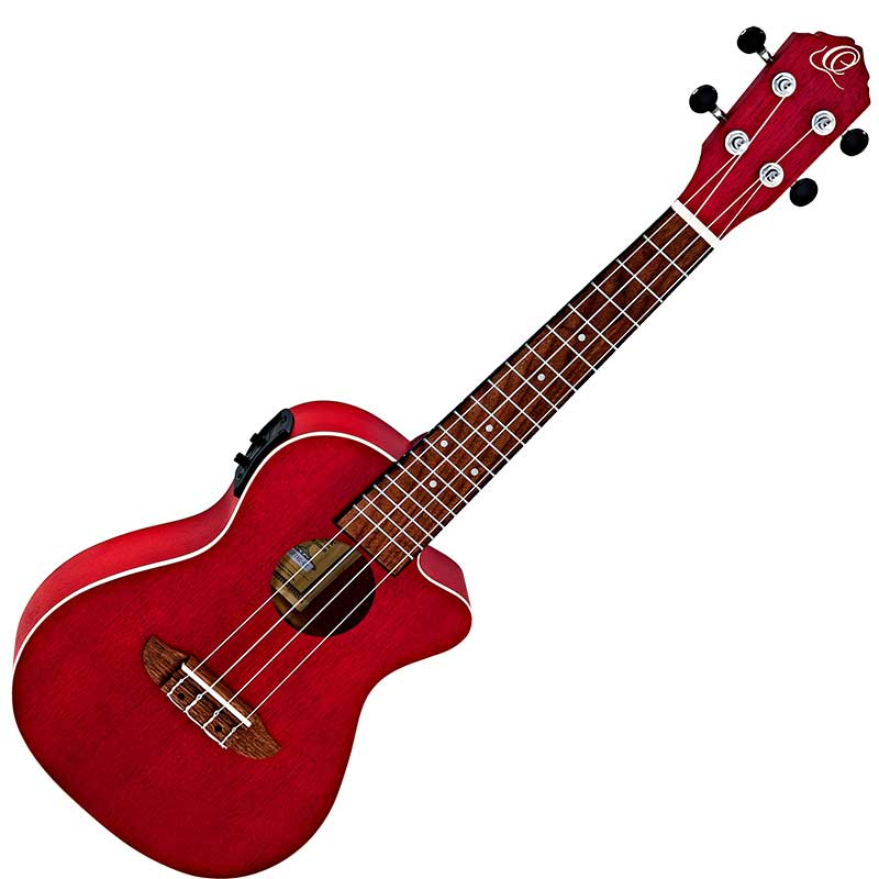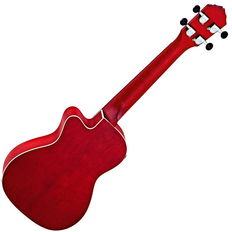 Ortega RUFIRE-CE ukulele is crafted from okoume. Which produces a resonant and balanced tone. Its concert body shape is a popular choice for Ukulele plays due to its extended range. And its cutaway design allows easier access to the higher frets. The mahogany neck is topped with a walnut fingerboard and 18 frets, providing a rich, warm tone and comfortable feel. For on-stage performers, the RUFIRE features a MagusUke preamp and pickup system, as well as a built-in tuner. Finally, this eye-catching Ukulele is finished in see through red satin, making it a perfect choice for any level of player.