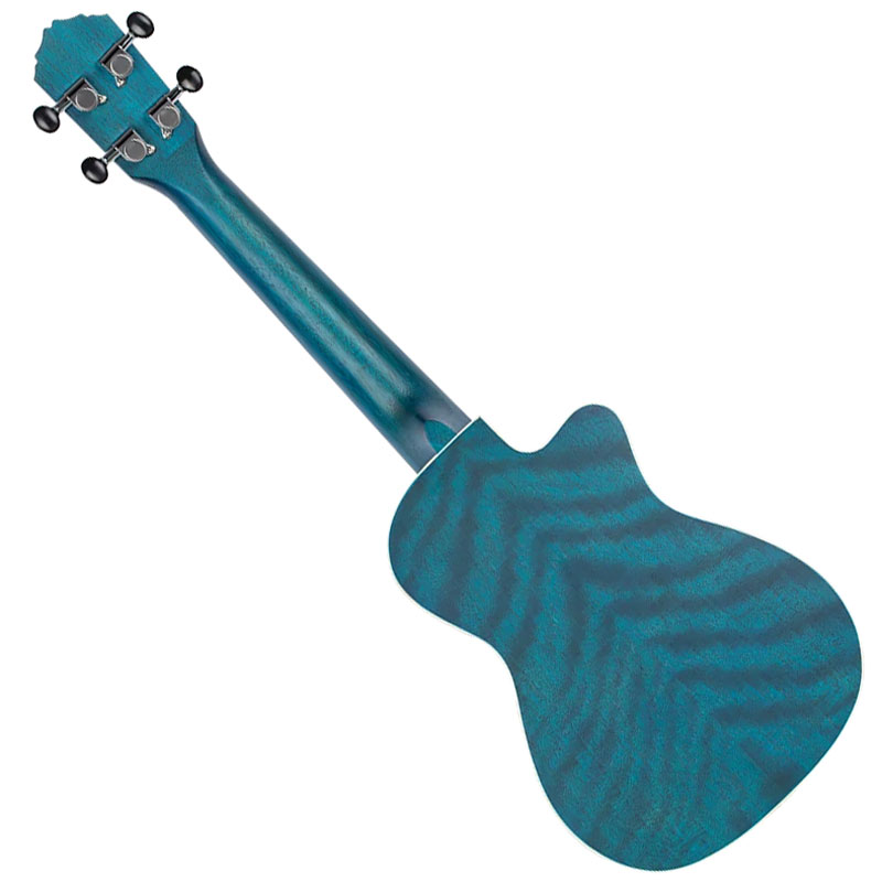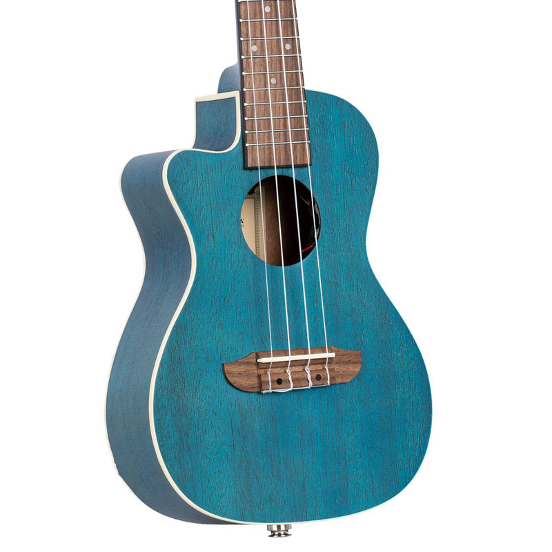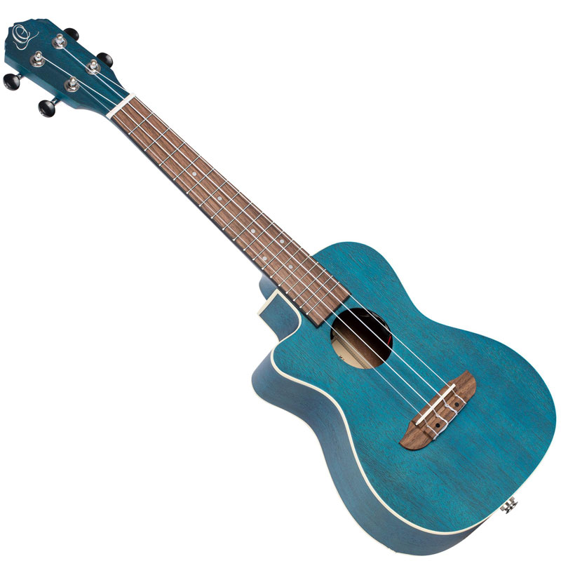 Ortega RUOCEAN-CE-L ukulele. Our popular Earth series is offered in 10 beautiful colors, with or without electronics. The colorful ukuleles have a transparent open pore finish and optional electronics with a built-in tuner.