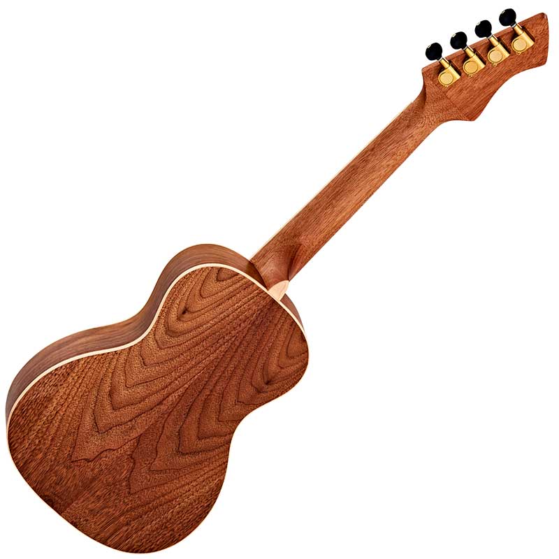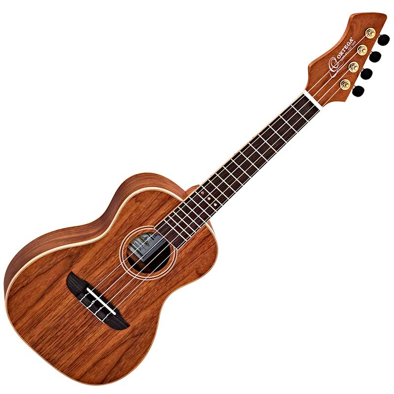 Ortega RUWN Concert Acoustic Ukulele. Walnut is constructed entirely from walnut, which produces a blend of earthy warm overtones. Present mid-range, and a bright top end with great projection. Its concert body is a popular choice for the ukulele soloist due to its extended range and 18 frets. It is allowing players to perform more technical skills with the freedom of an extended range to roam freely. The Ortega RUWN features a okoume neck with a satin finish, which delivers balance and a unique earthy tone. Whilst its satin finish provides a smooth and enjoyable playing experience, as well as adding a pleasing sonic character to the guitar's sound, letting the neck's individual tonality come alive. The Ortega RUWN also offers a stunningly stylish appearance due to its open pore natural finish, maple binding, reversed headstock design and gold tuners with black buttons, offering an elegant appearance with a sonically pleasing ukulele voice.