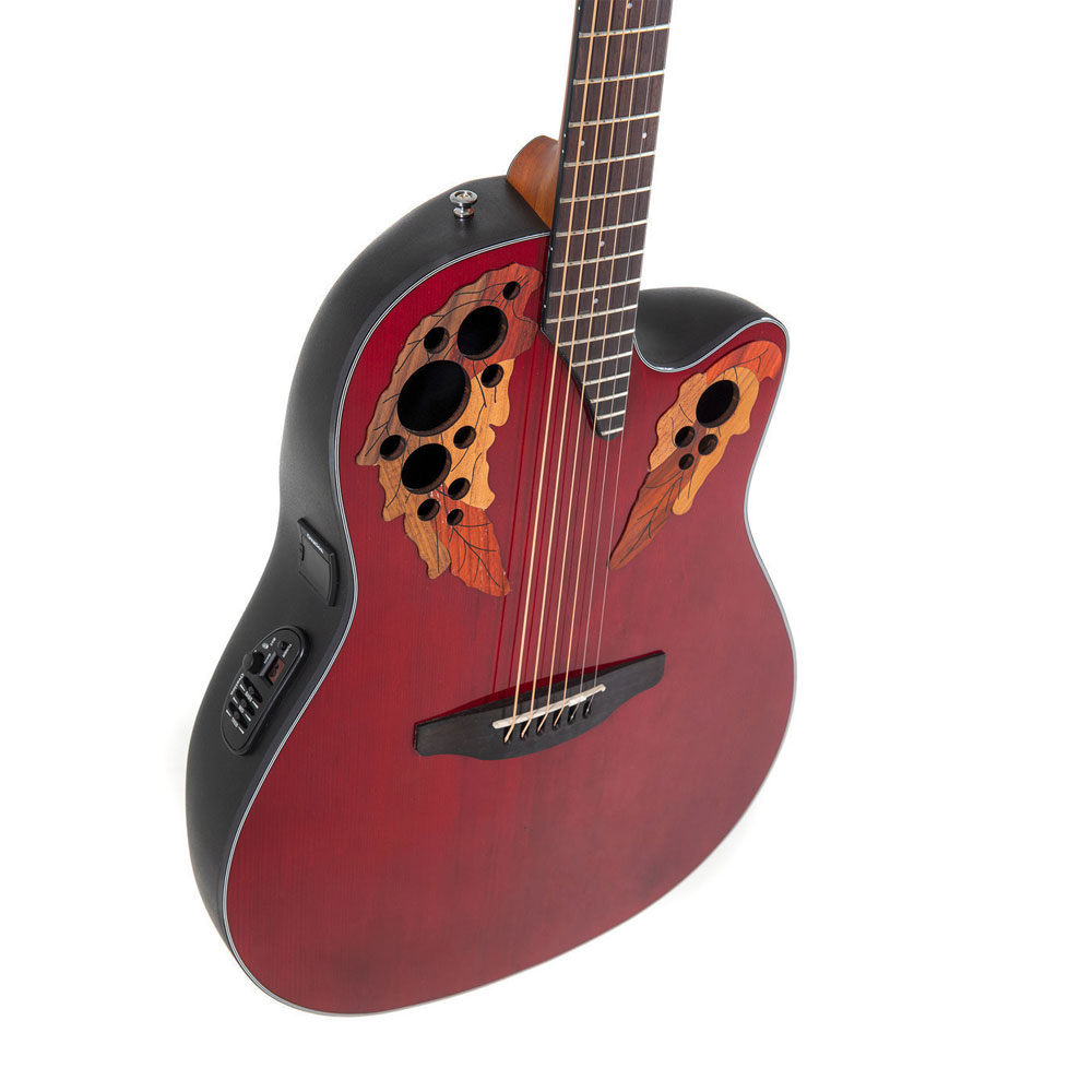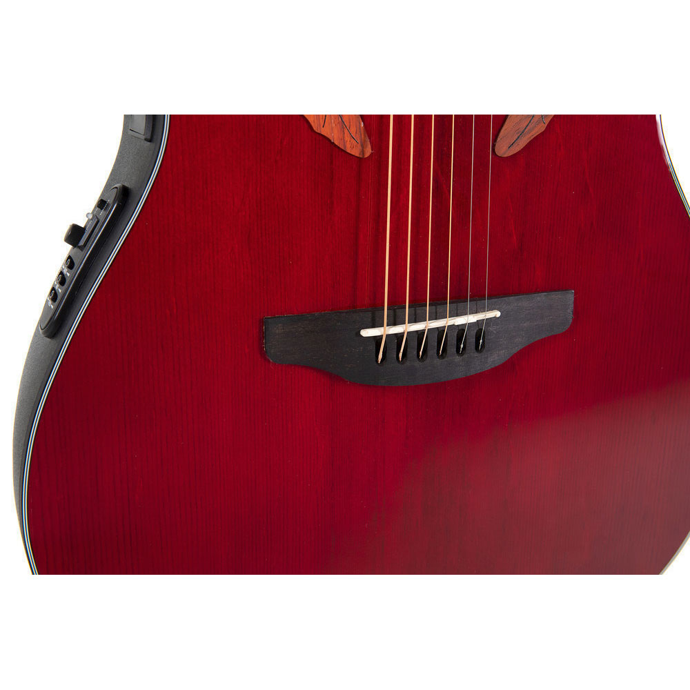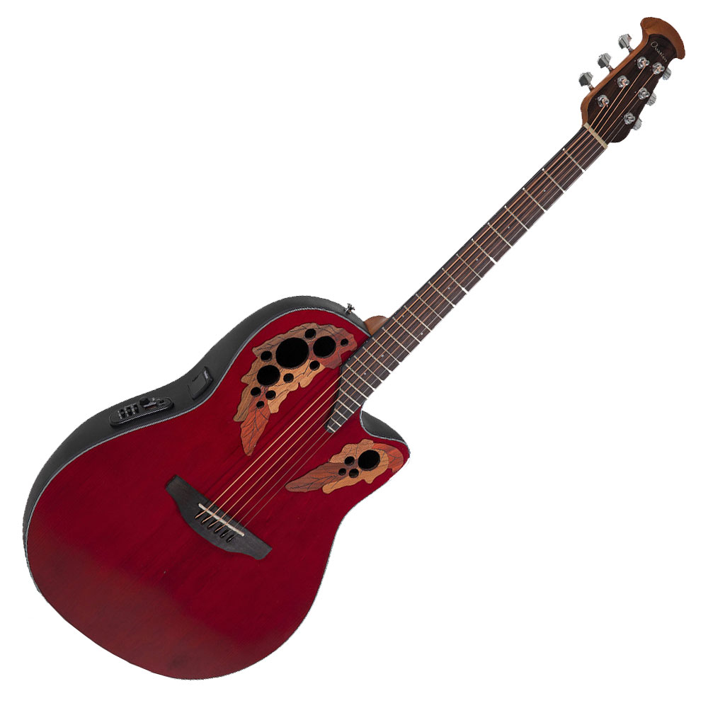 - CE44-RR poseduje kompozitno Lyrachord telo srednje dubine, sa isečkom, i punom gornjom pločom od smreke. Multi-port zvučni otvori osmišljeni su sa ciljem da smanje mikrofoniju, i unaprede odziv na niskim frekvencijama. Rezultat je jasan, fokusiran ton u celom opsegu. Mahagoni vrat, sa udobnim profilom. Ugrađeni CP100 piezzo pickup, i OP-4CT preamp sa 3-band EQ-om i integrisanim štimerom, profesionalnog ranga. Tradicionalna Ovation kobilica bez pinova poboljšava rezonanciju, i nudi bogat sustain. Izuzetno izbalansiran, neverovatno udoban instrument, sa klasičnim zvukom, obožavanim od muzičara širom sveta. Besprekoran kvalitet materijala i temeljna, precizna izrada osiguravaju bezbrižnu upotrebu i na najvećim binama. U Ruby Red finišu.