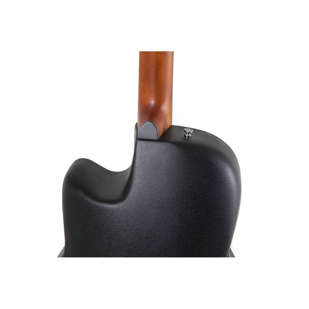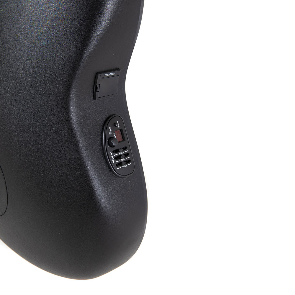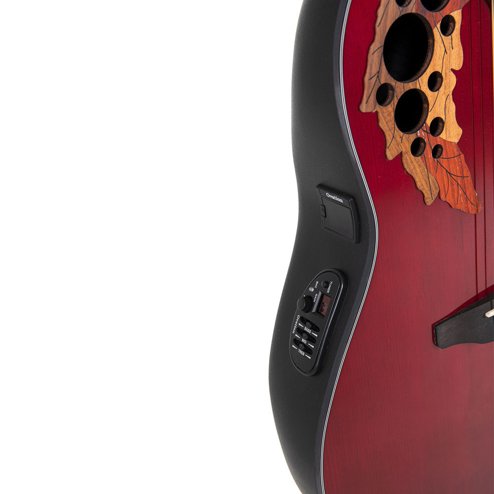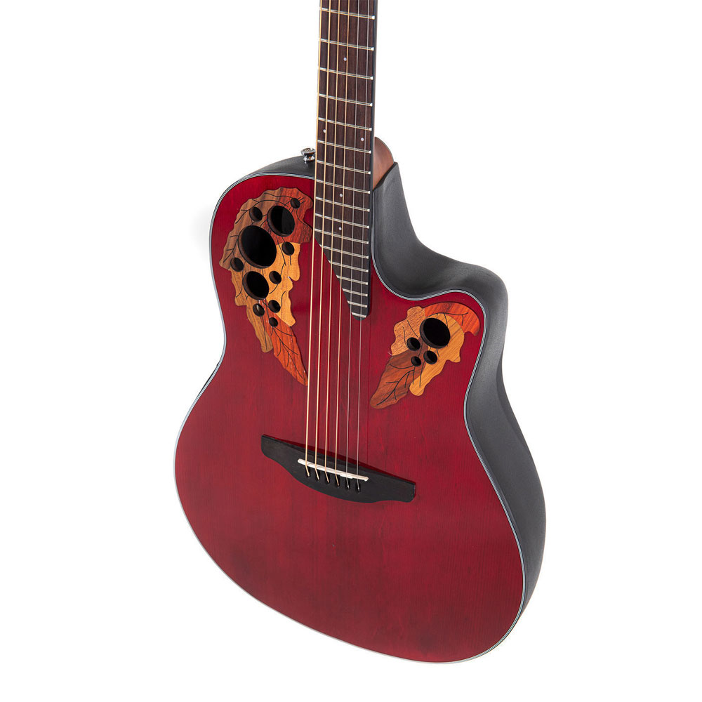 - CE44-RR poseduje kompozitno Lyrachord telo srednje dubine, sa isečkom, i punom gornjom pločom od smreke. Multi-port zvučni otvori osmišljeni su sa ciljem da smanje mikrofoniju, i unaprede odziv na niskim frekvencijama. Rezultat je jasan, fokusiran ton u celom opsegu. Mahagoni vrat, sa udobnim profilom. Ugrađeni CP100 piezzo pickup, i OP-4CT preamp sa 3-band EQ-om i integrisanim štimerom, profesionalnog ranga. Tradicionalna Ovation kobilica bez pinova poboljšava rezonanciju, i nudi bogat sustain. Izuzetno izbalansiran, neverovatno udoban instrument, sa klasičnim zvukom, obožavanim od muzičara širom sveta. Besprekoran kvalitet materijala i temeljna, precizna izrada osiguravaju bezbrižnu upotrebu i na najvećim binama. U Ruby Red finišu.