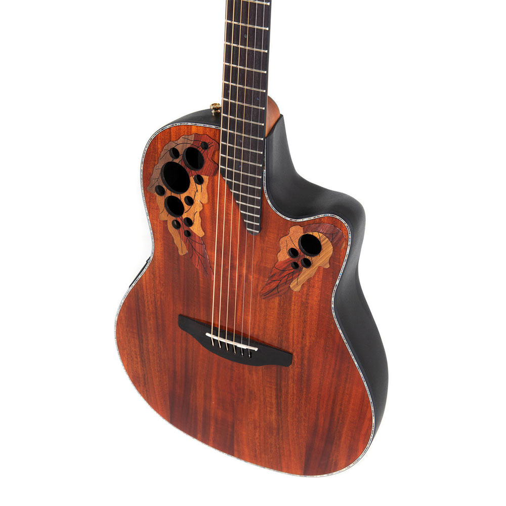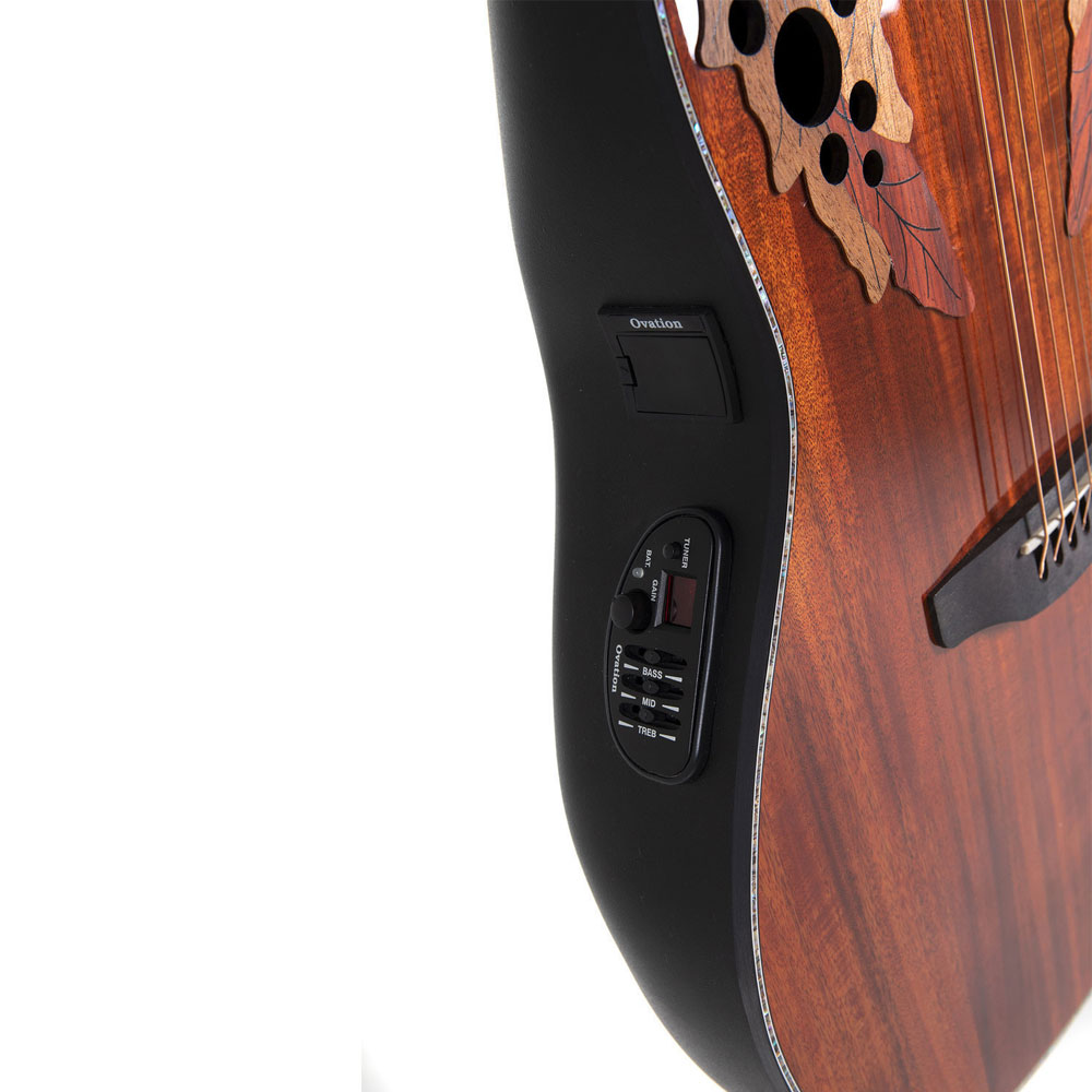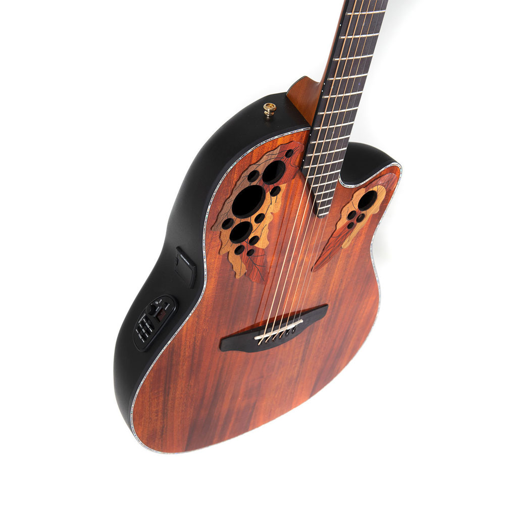- Specifičan oblik leđa je decenijama zaštitni znak Ovation modela, i u direktnoj je vezi sa njihovim jedinstvenim zvučnim izrazom. Čvrst, stabilan vrat od mahagonija nosi veoma udoban profil, uz širinu konjića od 42,8 mm. Ugrađena šipka garantuje uvek optimalan setup instrumenta, bez obzira na debljinu žica ili klimatske prilike. CP-100 piezo pickup i OP-4CT preamp savršeno se snalaze u svim situacijama snimanja ili živih nastupa. Tradicionalna Ovation kobilica bez pinova poboljšava rezonanciju, i nudi bogat sustain. Izuzetno izbalansiran, neverovatno udoban instrument, sa klasičnim Ovation zvukom, obožavanim od muzičara širom sveta. Besprekoran kvalitet materijala i temeljna, precizna izrada osiguravaju bezbrižnu upotrebu i na najvećim binama. U atraktivnom Figured Koa finišu.