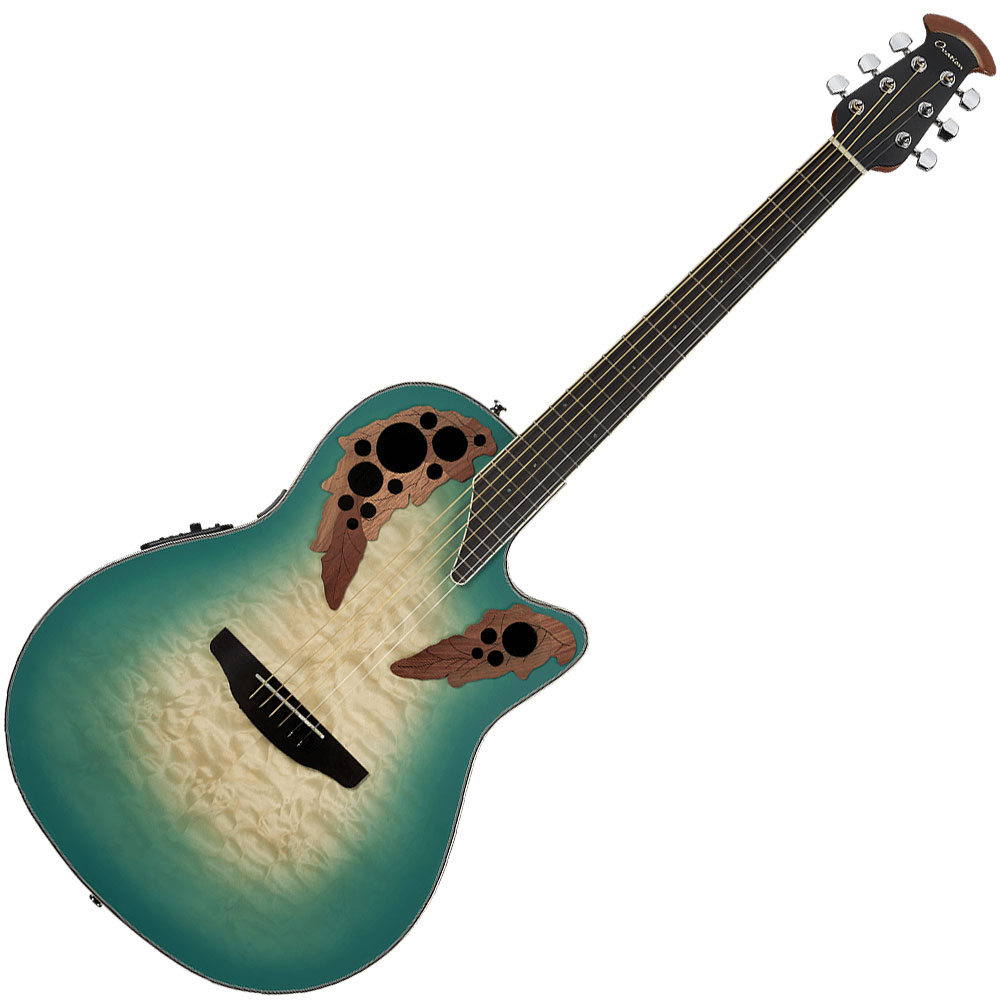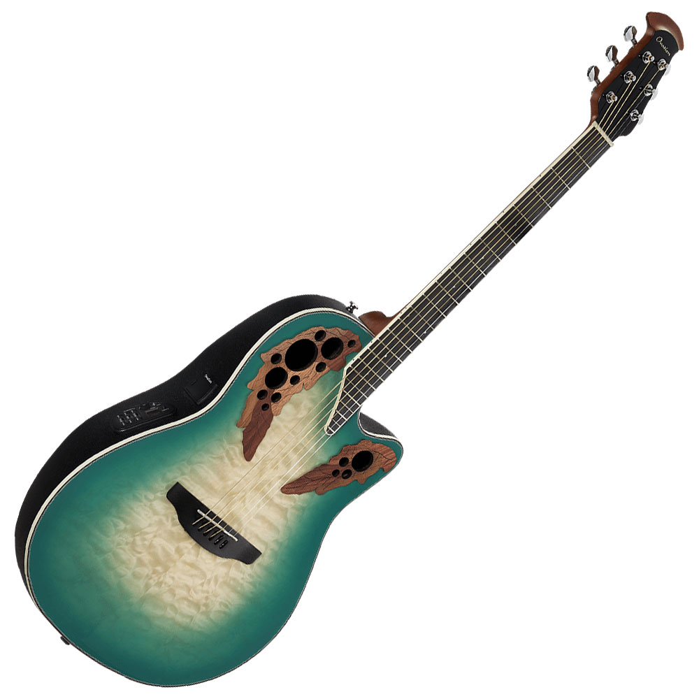 - Celebrity Elite CE44X-9B poseduje kompozitno Lyrachord telo srednje debljine, sa isečkom, i gornjom pločom od školjkastog javora. Patentirani Multi-port zvučni otvori osmišljeni su sa ciljem da smanje mikrofoniju, i unaprede odziv na niskim frekvencijama. Brižljiva unutrašnja konstrukcija sa X upornicama omogućava ogroman, zaokružen akustični ton, sa jasnom definicijom u svim opsezima. Specifičan oblik leđa je decenijama zaštitni znak Ovation modela, i u direktnoj je vezi sa njihovim jedinstvenim zvučnim izrazom. Čvrst, stabilan vrat od mahagonija nosi veoma udoban profil, uz širinu konjića od 43 mm. Skala od 25.3 inča, radijus od 10 inča i 23 praga odgovaraju većini sviračkih stilova. Ugrađena šipka garantuje uvek optimalan setup instrumenta, bez obzira na debljinu žica ili klimatske prilike. CP-100 piezo pickup i OP-4CT preamp savršeno se snalaze u svim situacijama snimanja ili živih nastupa. Tradicionalna Ovation kobilica bez pinova poboljšava rezonanciju, i nudi bogat sustain. Izuzetno izbalansiran, neverovatno udoban instrument, sa klasičnim Ovation zvukom, obožavanim od muzičara širom sveta. Besprekoran kvalitet materijala i temeljna, precizna izrada osiguravaju bezbrižnu upotrebu i na najvećim binama. U atraktivnom Mint Green/Natural Burst finišu.