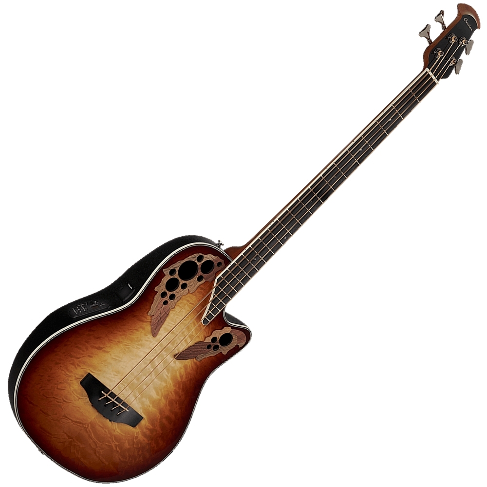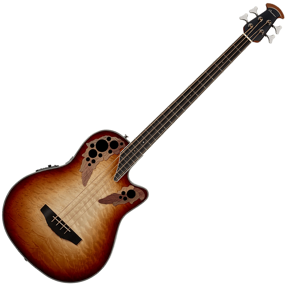 - Celebrity Elite Plus CEB44X-7C poseduje kompozitno Lyracord telo srednje dubine, kombinovano sa gornjom pločom od školjkastog javora. Patentirani Multi-port zvučni otvori osmišljeni su sa ciljem da smanje mikrofoniju, i unaprede odziv na niskim frekvencijama. Rezultat je jasan, fokusiran ton u celom opsegu, uz veliku akustičku glasnoću. Brižljiva unutrašnja konstrukcija sa X upornicama i specifičan oblik leđa su decenijama zaštitni znak Ovation modela, i u direktnoj su vezi sa njihovim jedinstvenim zvučnim izrazom. Čvrst, stabilan vrat od mahagonija nosi veoma udoban profil, uz standardnu skalu od 34 inča. Radijus od 10 inča i 21 prag odgovaraće za većinu sviračkih stilova, dok ugrađena šipka garantuje uvek optimalan setup instrumenta, bez obzira na debljinu žica ili klimatske prilike. OCP100 piezo pickup i OP-4CT preamp savršeno se snalaze u svim situacijama snimanja ili živih nastupa. Tradicionalna Ovation kobilica bez pinova poboljšava rezonanciju, i nudi bogat sustain. Izbalansiran, izuzetno svirljiv akustični bas sa ogromnim tonom, pogodan za kućne svirače, ali i profesionalce. Besprekoran kvalitet materijala i temeljna, precizna izrada osiguravaju bezbrižnu upotrebu i na najvećim binama. U atraktivnom Cognac Burst finišu u visokom sjaju.