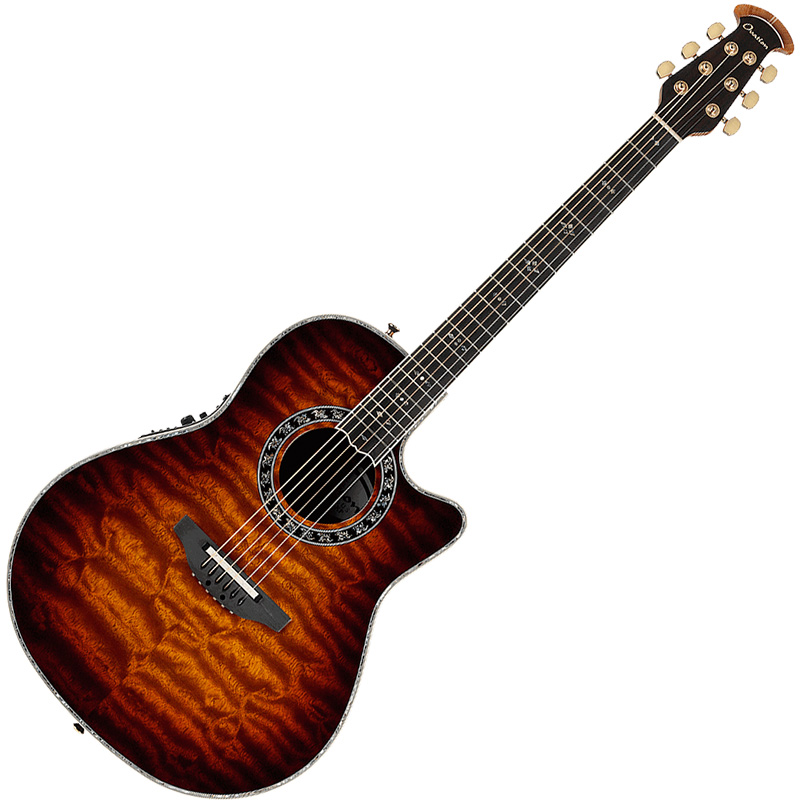 Artistry. All ExoticWoods Collection instruments use hand-selected exotic woods, artfully book-matched in California to create a distinctive, one-of-kind look that would make Mother Nature proud. This exceptional guitar features figured Sapele in a tobacco burst finish. The striking exotic top is layered on top of other tone woods to create a musical soundboard voiced with LX scalloped bracing and an ebony bridge. Legend models are crafted using a traditional center soundhole design and combine legendary Ovation tone, playability and optimized electronics. Our Lyrachord composite, deep contour body maximizes acoustic output, and is ergonomically designed for comfort in any playing position. A cutaway offers full access to the fast playing 5-piece mahogany/maple neck that is topped with an ebony fretboard. The OP-Pro Studio preamp includes a compressor and an EQ that makes dialing in your sound easy with any sound system, stage amp, or recording console. The ExoticWoods Collection...like every artist, every instrument is unique. Includes hardshell case.