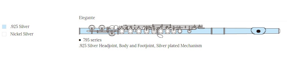 - Zahvaljujući ručnoj izradi, specifičnoj Pearl mehanici, kao i odabiru najkvalitetnijeg steriling 925 srebra, ova flauta predstavlja pravi izbor za studente, poluprofesionalce, ali i za sve flautiste koji žele kvalitetan srebrni instrument. Pearl Elegante 795RBE je flauta koja ima srebrnu glavu i telo, posrebreni mehanizam, otvorene klapne, E mehaniku i H(B) nogu.