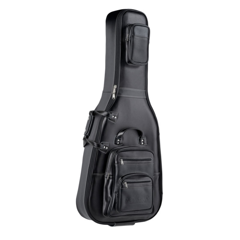 Rockbag RB 20209 B Handmade Leather, Padded leather bag for acoustic guitar. Genuine Handmade Leather series. Handmade with carefully selected buffalo leather. Padding 28.5mm (EVA foam 2mm + polystyrene 5mm + rigid plastic 1.5mm + foam 15mm + foam high density 5mm) - 40mm EVA reinforcement on all sides - 2-way zip 1 wide,0cm with metal zipper - Inner lining in black velvet - Equipped with Guitar-Saving-System (extra protective cushion in correspondence of the strap-lock) and Neck-Saving-System
