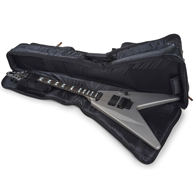 Rockbag RB 20506 FV DB B Deluxe Line, Padded bag for FV Style electric guitar. Made of sturdy water-resistant RokTex fabric - 20mm padding - 2-way zip 0,8cm wide with nylon zip - Internal lining in black nylon. Equipped with Guitar-Saving-System (extra protective cushion at the strap-lock) and Neck-Saving-System (extra protective cushion and safety strap with Velcro for fixing the neck) for maximum protection - RokTex protective patches at the mechanical and bridge. Large front pocket with zip and 2 compartments (able to house the RockStand Worwei guitar support).