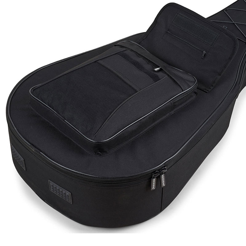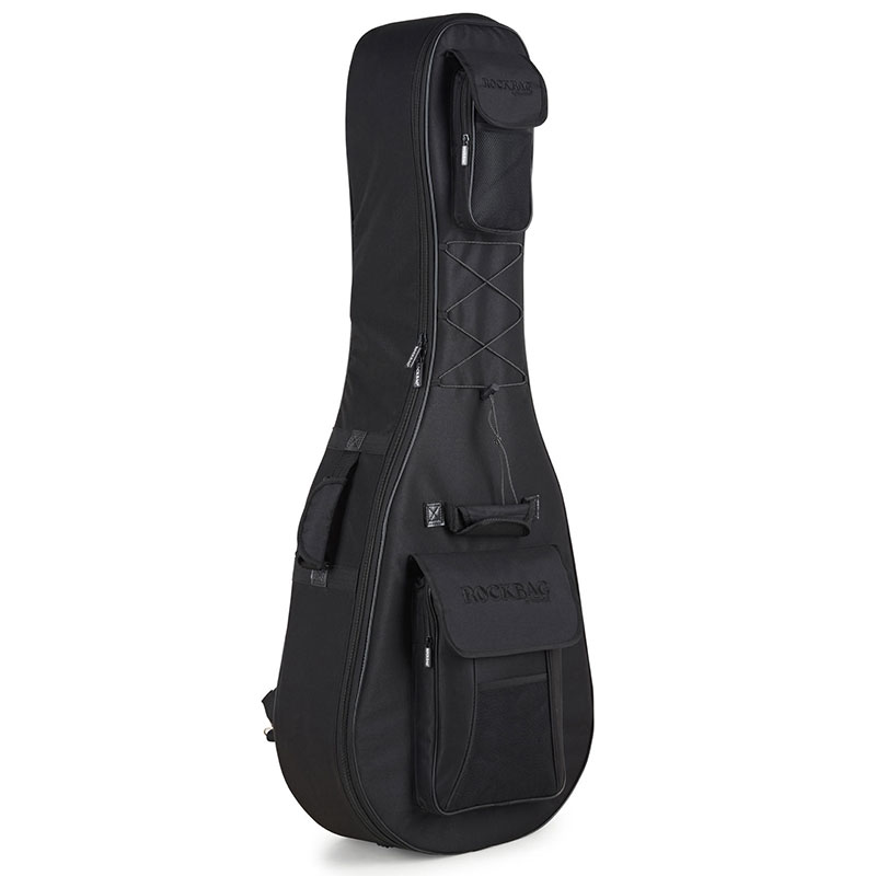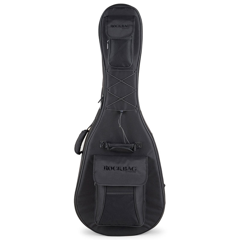 RockBag RB 20510 STARLINE. Padded bag for acoustic bass - Starline Series. Made of sturdy 600 denier polyester water resistant - 27mm padding (foam 20mm + polystyrene 5mm + rigid plastic 2mm). 2-way zip 1, wide0cm with nylon zipper - Inner lining in black velvet - Equipped with Guitar-Saving-System (extra protective cushion in correspondence of the strap-lock) and Neck-Saving-System (extra protective cushion and safety strap with velcro for fixing the neck) for maximum protection - RokTex protective patches in correspondence with the mechanics and the bridge.