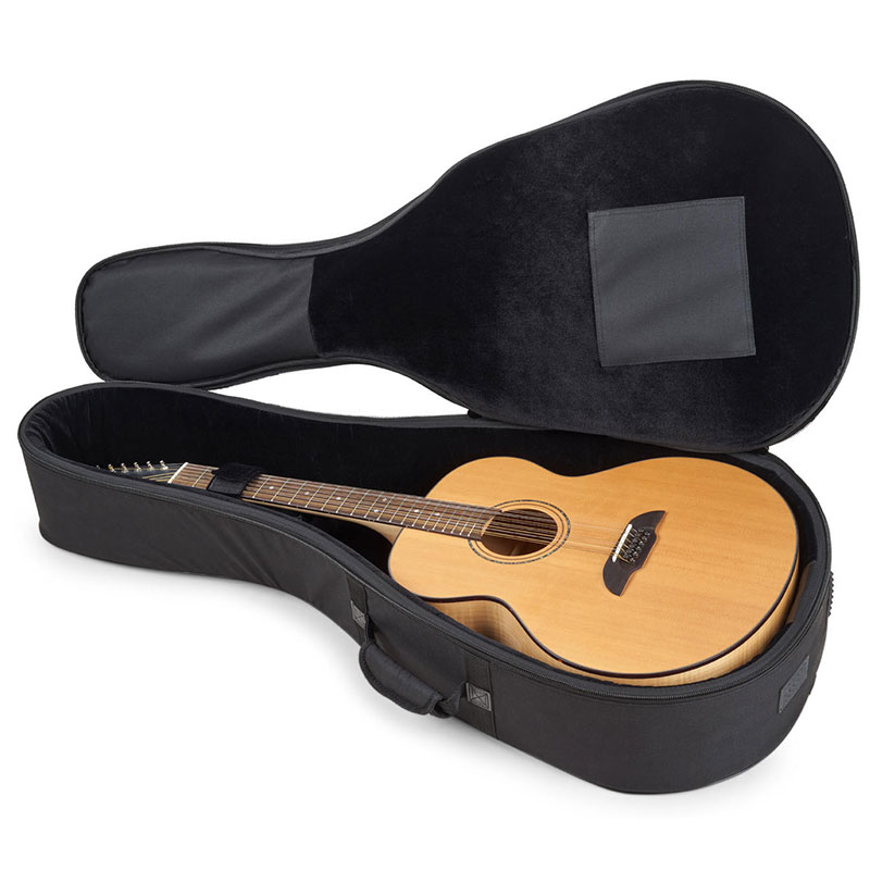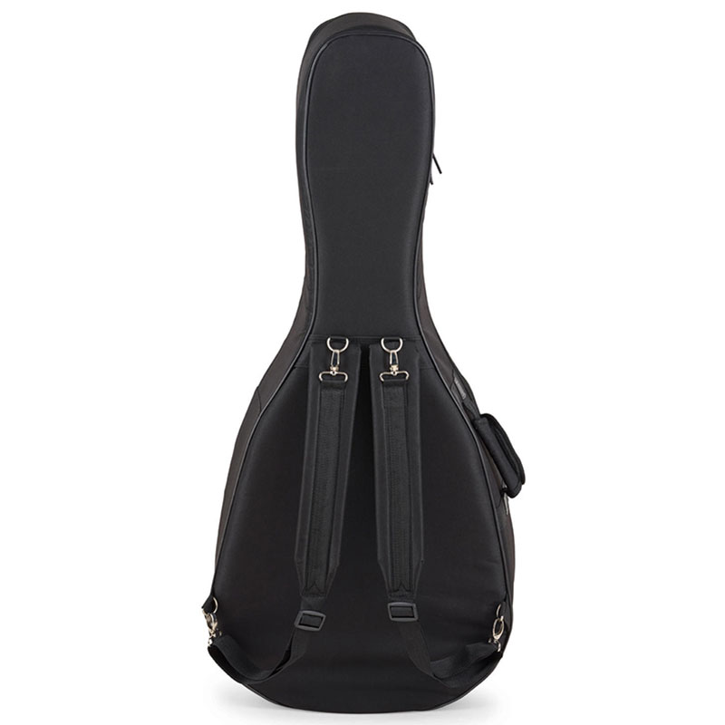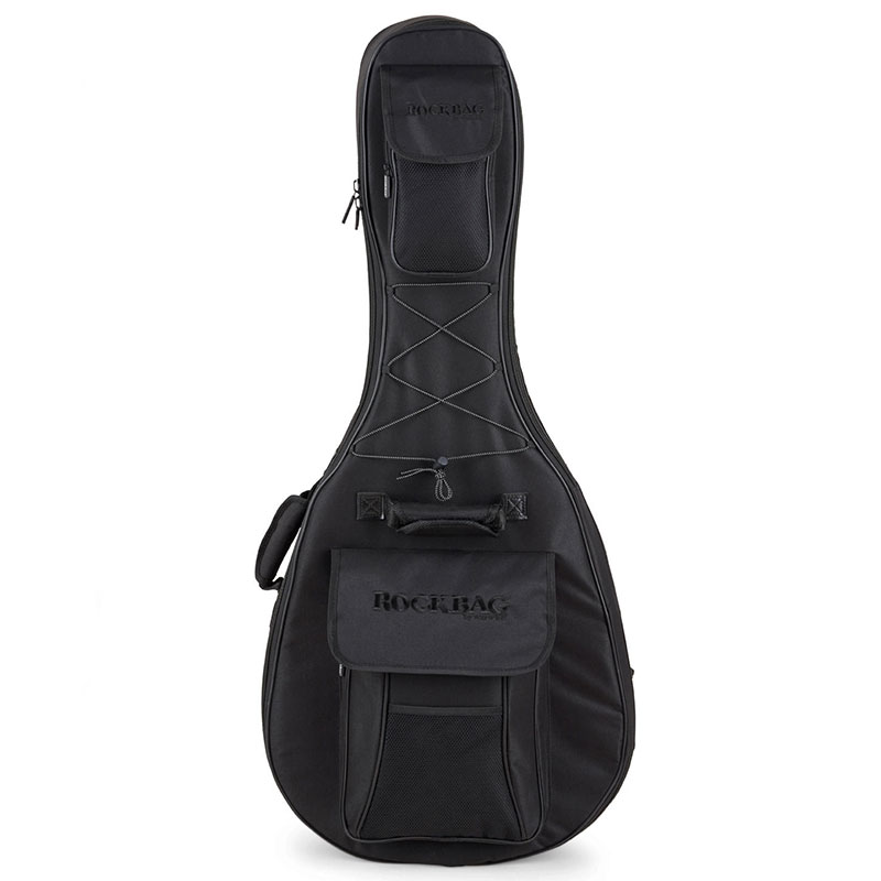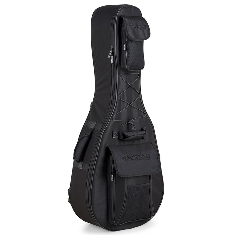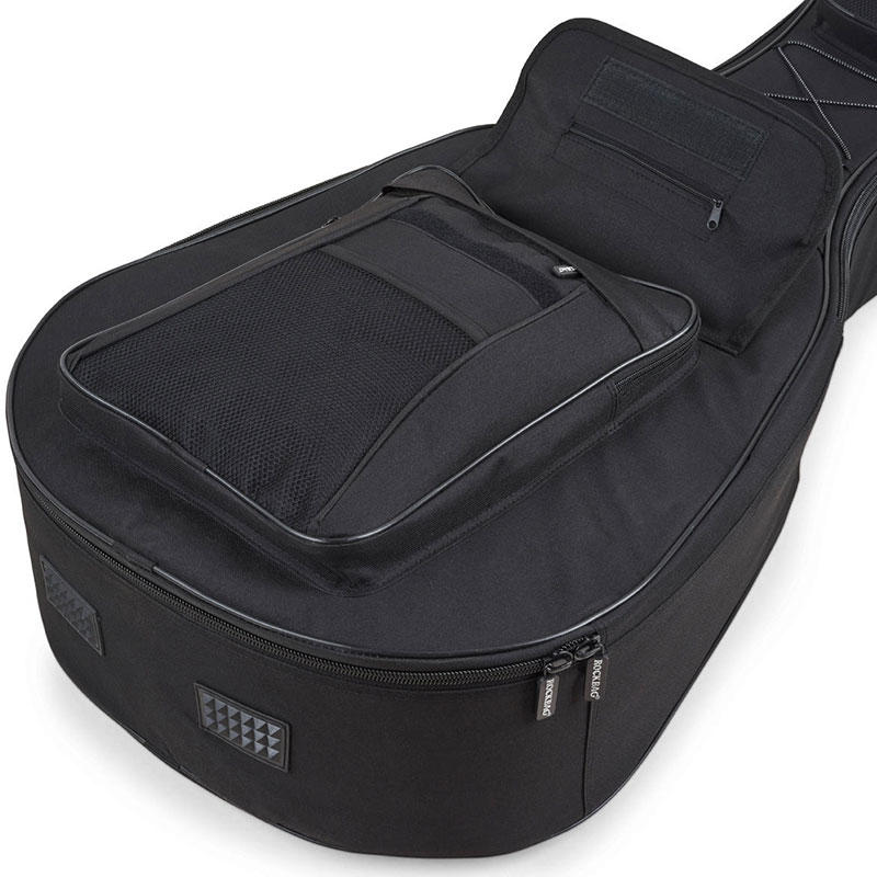 Rockbag RB 20514 STARLINE, Padded bag for jumbo guitar - Starline series. Made of sturdy 600 denier polyester water resistant - 27mm padding (foam 20mm + polystyrene 5mm + rigid plastic 2mm). 2-way zip 1 wide,0cm with nylon zipper - Inner lining in black velvet. Equipped with Guitar-Saving-System (extra protective cushion in correspondence of the strap-lock) and Neck-Saving-System for maximum protection. RokTex protective patches in correspondence with the mechanics and the bridge - Large front pocket with zip and 4 compartments (able to house the RockStand Worwei guitar support).
