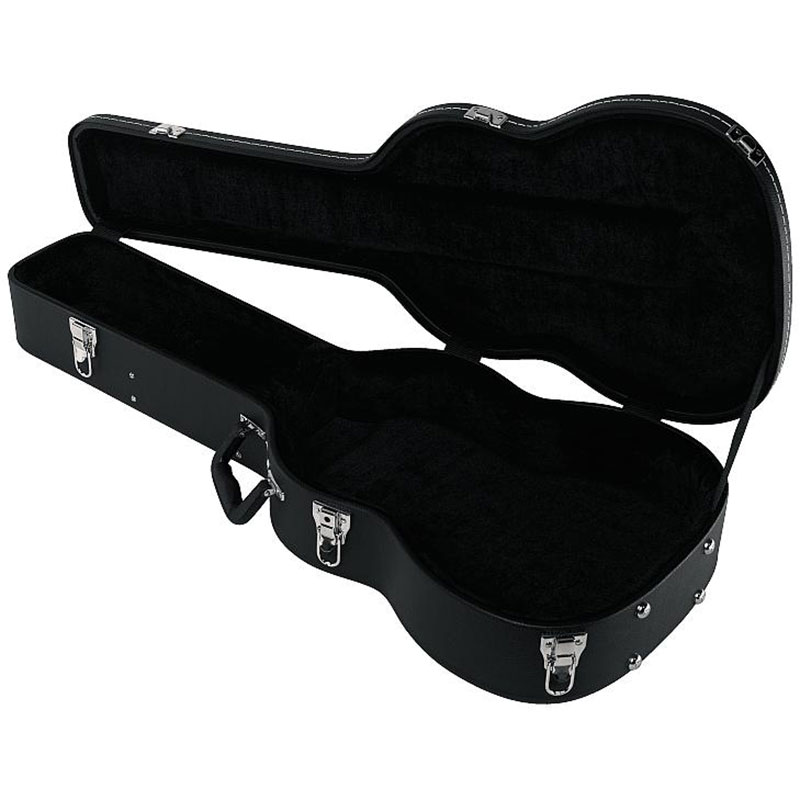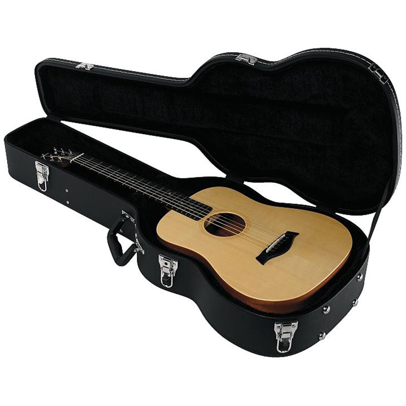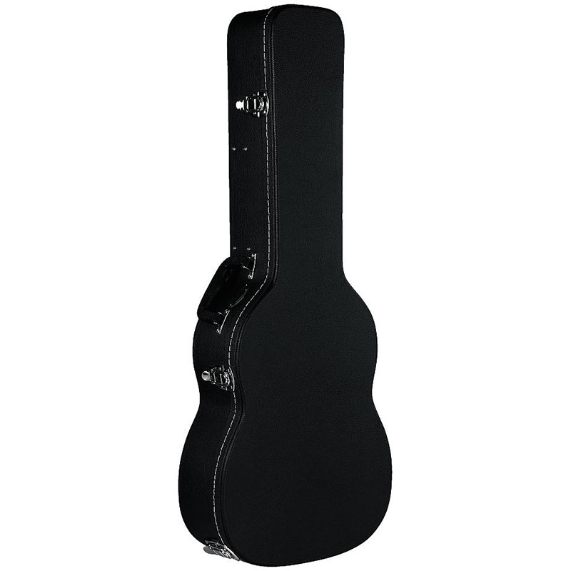 RockCase RC 10615 B/SB. Robust guitar wood case with flat top and black Tolex surface material for every Mini Acoustic Guitar. For ideal instrument protection guarantees the wide neck holder with additional neck cushion and Headstock Support System, as well as a thick foam insert in the middle of the cask cover and the with foam rubber amplified inner edge. The black velvet design preserves the damageable instruments finish. Separate interior compartment with cover for storage of different accessories. Massive locks, metal feets and a robust PVC handle care for a stress free handling.