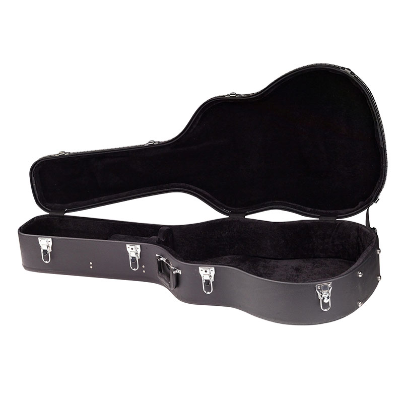 RockCase RC 10619 BCT/SB. Robust guitar wood case with curved top and black Tolex surface material for every Folk Guitar. For ideal instrument protection guarantees the wide neck holder with additional neck cushion and Headstock Support System, as well as a thick foam insert in the middle of the cask cover and the with foam rubber amplified inner edge. The black velvet design preserves the damageable instruments finish. Separate interior compartment with cover for storage of different accessories. Massive locks, metal feets and a robust PVC handle care for a stress free handling.