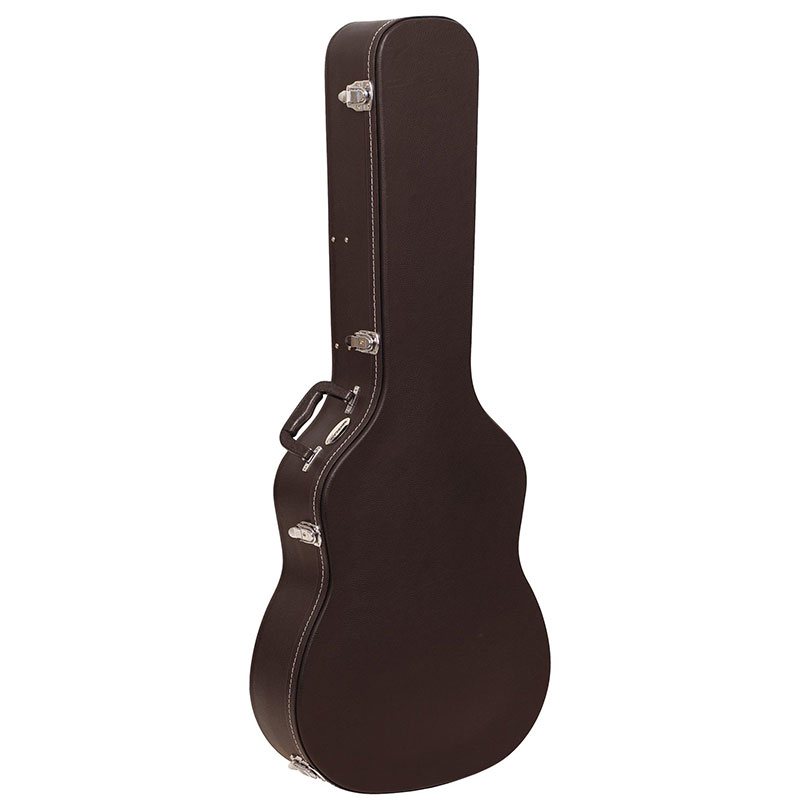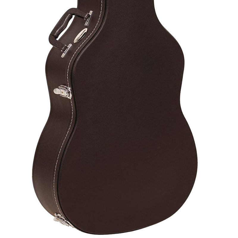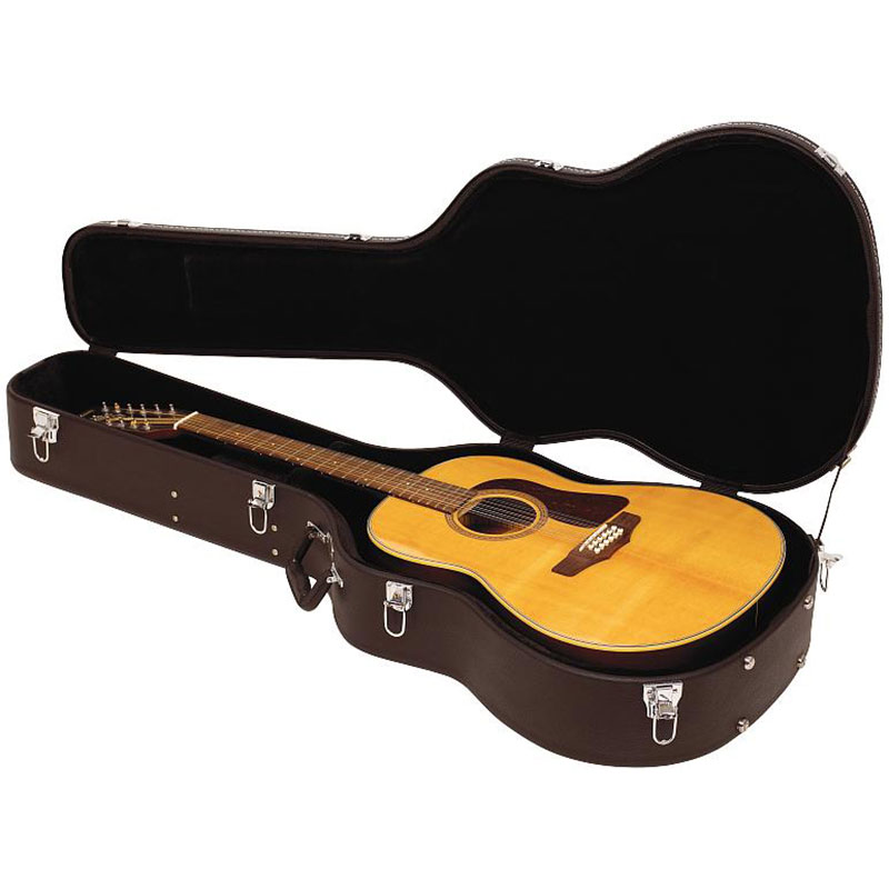 RockCase RC 10631 BCT/SB. Robust guitar wood case with curved lid and black Tolex surface material for every 12-String Dreadnought Guitar. For ideal instrument protection guarantees the wide neck holder with additional neck cushion and Headstock Support System, as well as a thick foam insert in the middle of the cask cover and the with foam rubber amplified inner edge. The black velvet design preserves the damageable instruments finish. Separate interior compartment with cover for storage of different accessories. Massive locks, metal feets and a robust PVC handle care for a stress free handling.
