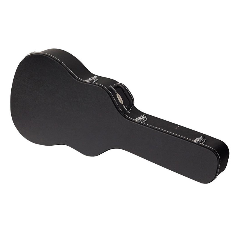 RockCase RC 10709 B/SB. Professional guitar wood case with flat lid and black Tolex surface material for every Folk Guitar. For ideal instrument protection guarantees the wide neck holder with additional neck cushion and Headstock Support System, as well as a thick foam insert in the middle of the cask cover and the with foam rubber amplified inner edge. The all around sewed interior coating out of long hair plush preserves the damageable instruments finish. Separate interior compartment with cover for storage of different accessories. Massive locks, metal feets and a robust PVC handle care for a stress free handling.