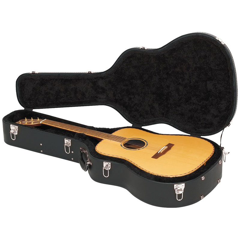 RockCase RC 10719 BCT/SB. Professional guitar wood case with curved lid and black Tolex surface material for every Folk Guitar. For ideal instrument protection guarantees the wide neck holder with additional neck cushion and Headstock Support System, as well as a thick foam insert in the middle of the cask cover and the with foam rubber amplified inner edge. The all around sewed interior coating out of long hair plush preserves the damageable instruments finish. Separate interior compartment with cover for storage of different accessories. Massive locks, metal feets and a robust PVC handle care for a stress free handling.
